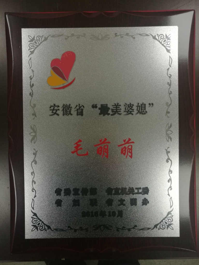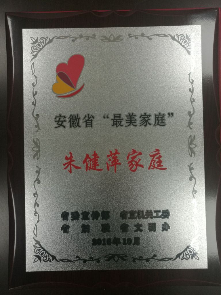 榮譽,其中,我公司朱健萍家庭、毛萌萌分別被授予安徽省2016年度“最美家庭”