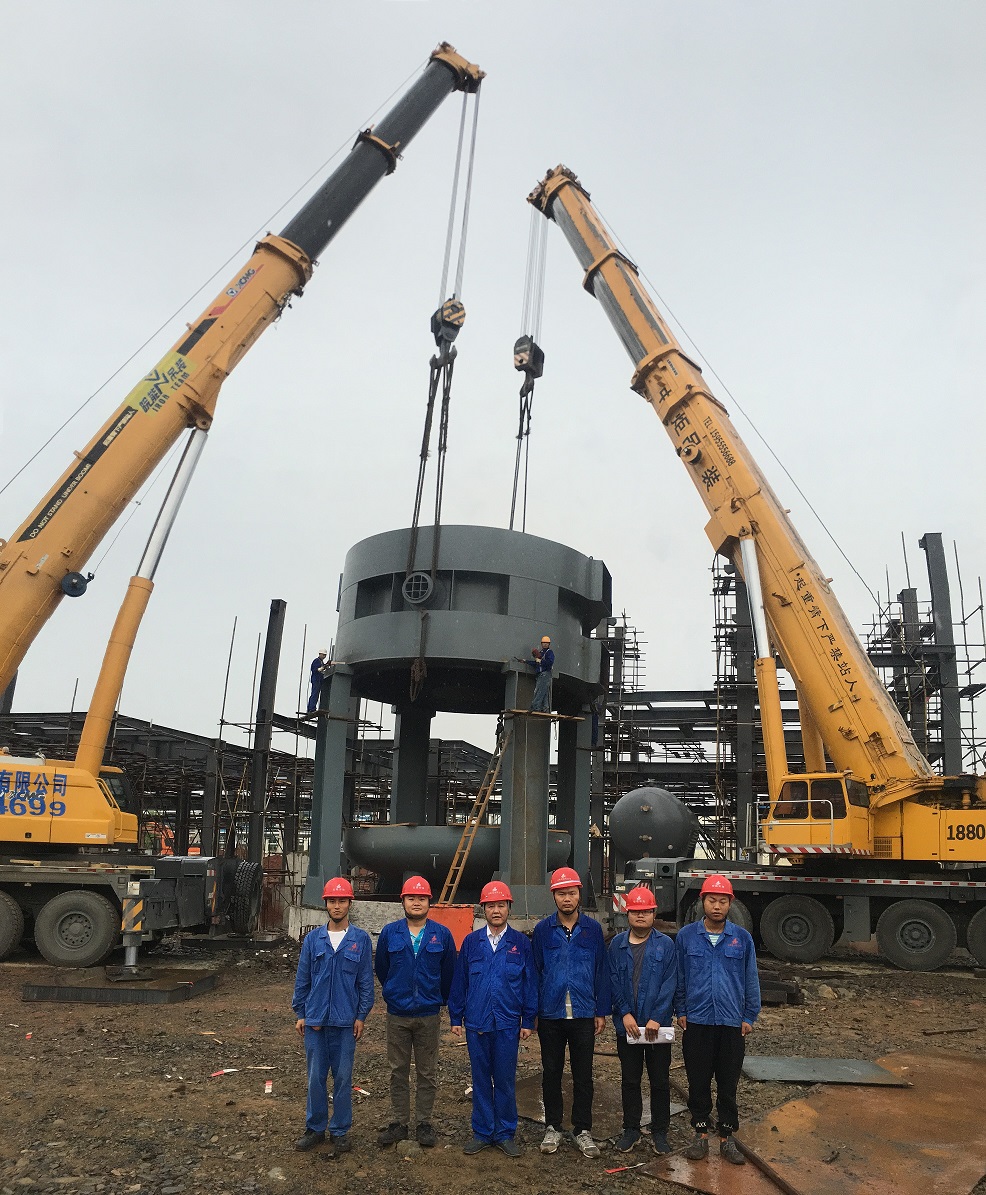 本次吊裝的反應器中段部分重達220噸,分公司領導高度重視,吊裝前期,邀請公司總工吳繼成、總工辦主任牛守義和安全部王岳濤經理親臨項目部參與設備吊裝的專題方案討論定稿工作。當日上午,吊裝現場準備工作緊張卻又有條不紊的進行,項目經理李子鳳向全體“參戰”員工進行了安全交底,工作人員對兩臺分別為500T、350T吊車的站位及性能再次確認,現場機具、人員均按既定方案實施。分公司經理史崇松、業主單位負責人、監理全程在現場“督戰”,全體工作人員經過四個小時的奮戰,吊裝作業圓滿結束。