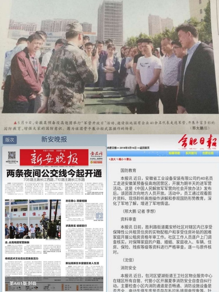 自5月(yue)9日(ri)安(an)徽(hui)安(an)裝公司組織(zhi)開(kai)展赴安(an)徽(hui)預備役師高炮(pao)團(tuan)營區開(kai)展“走進(jin)軍(jun)營·感(gan)受軍(jun)魂”愛(ai)國主義(yi)教(jiao)育(yu)實踐活動以來(lai),合肥(fei)日(ri)報(bao)(bao)、新安(an)晚報(bao)(bao)、人民陸軍(jun)報(bao)(bao)等多家(jia)媒體(ti)對此活動進(jin)行(xing)了報(bao)(bao)道(dao)。