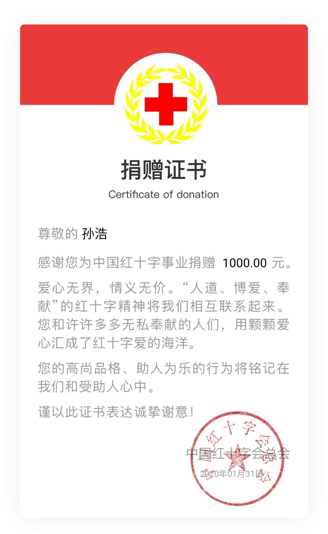 自新型冠(guan)狀病毒引發(fa)的肺炎疫(yi)情從湖(hu)北武(wu)漢(han)爆發(fa)以(yi)來,始終牽動(dong)著眾人(ren)的心(xin),更(geng)有不少(shao)愛(ai)心(xin)人(ren)士(shi)主動(dong)奉獻愛(ai)心(xin)。1月31日,孫浩(hao)一家(jia)三口懷著對武(wu)漢(han)疫(yi)區同胞深深的愛(ai),向(xiang)中國紅(hong)十字(zi)會(hui)捐款抗擊疫(yi)情,以(yi)表(biao)達(da)對武(wu)漢(han)疫(yi)區人(ren)民(min)的關愛(ai)。