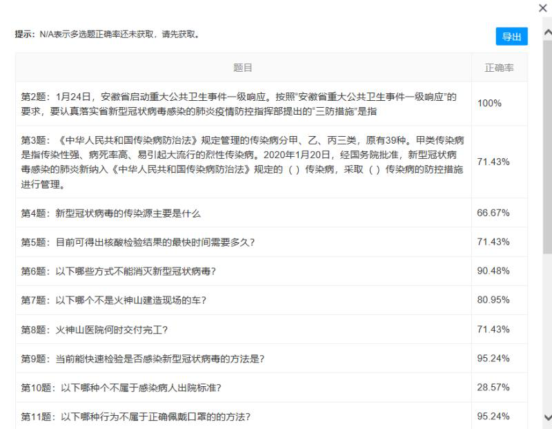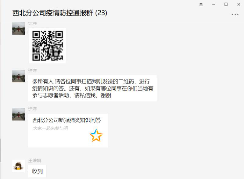 本次(ci)(ci)疫(yi)(yi)情(qing)防控(kong)知識答題通過在分公司微信群發送答題鏈接開展,內容涵蓋新冠肺炎基本知識、疫(yi)(yi)情(qing)防控(kong)措(cuo)施、員(yuan)工居家防控(kong)等多項內容,同時(shi)還(huan)對上級在疫(yi)(yi)情(qing)期(qi)間下發的(de)各(ge)類(lei)疫(yi)(yi)情(qing)防控(kong)工作指導意見、措(cuo)施等進行了宣(xuan)貫。此次(ci)(ci)活動,員(yuan)工參與率達(da)到(dao)了(le)100%,不(bu)僅(jin)加(jia)強了(le)(le)(le)員(yuan)(yuan)工對防(fang)(fang)(fang)疫(yi)(yi)(yi)知識(shi)(shi)的(de)了(le)(le)(le)解(jie),還提高了(le)(le)(le)預防(fang)(fang)(fang)疾病(bing)自(zi)我保(bao)護的(de)意識(shi)(shi),防(fang)(fang)(fang)疫(yi)(yi)(yi)知識(shi)(shi)掌握情(qing)況總體較好。通過參與答(da)題,廣(guang)大員(yuan)(yuan)工進一步了(le)(le)(le)解(jie)了(le)(le)(le)新冠(guan)肺炎的(de)傳(chuan)播途徑(jing)及相(xiang)關防(fang)(fang)(fang)護措(cuo)施,表(biao)示要努(nu)力做到(dao)認真理性對待疫(yi)(yi)(yi)情(qing),保(bao)持良好個人生活習(xi)慣(guan)和公共衛生習(xi)慣(guan),遵守(shou)疫(yi)(yi)(yi)情(qing)防(fang)(fang)(fang)控(kong)工作要求,胸懷(huai)全(quan)局(ju)、統一思想,堅決打(da)贏疫(yi)(yi)(yi)情(qing)防(fang)(fang)(fang)控(kong)阻擊戰(zhan)。