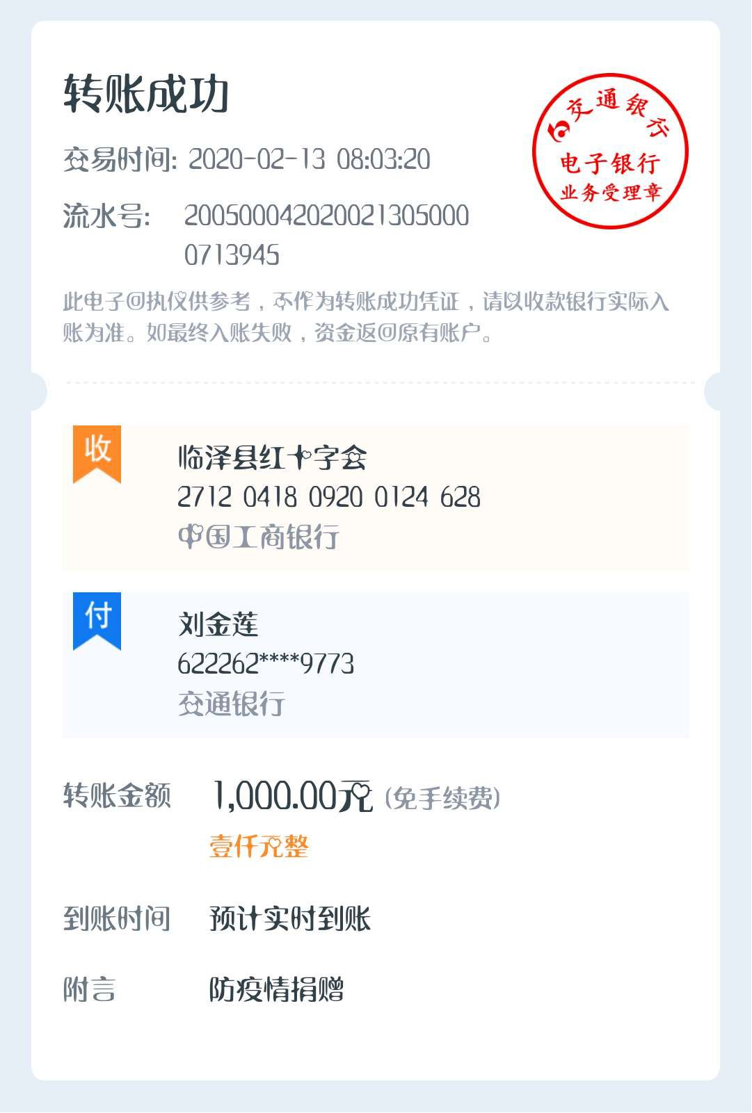她就(jiu)是寧夏辦事處職工(gong)劉金蓮同志。劉金蓮同志在(zai)工(gong)作(zuo)中認真(zhen)積(ji)極(ji),是一名陽(yang)光樂觀、任勞任怨的優秀(xiu)員工(gong),她在(zai)平(ping)時生(sheng)活工(gong)作(zuo)中也總是積(ji)極(ji)主動的幫助他人。在(zai)這(zhe)次疫情爆發后(hou),2月(yue)13日,劉金蓮同志主動聯(lian)系當(dang)地甘(gan)肅省(sheng)臨(lin)澤縣紅(hong)(hong)十字(zi)會(hui),通(tong)過線(xian)上微信(xin)轉(zhuan)賬(zhang)的方式,轉(zhuan)給紅(hong)(hong)十字(zi)會(hui)捐(juan)款人民(min)幣1000元(yuan)。接下來,她又主動聯系(xi)當地紅十字會工作人(ren)員,要求主動擔(dan)當志(zhi)愿者,但(dan)是因為客觀原因,沒有被批(pi)準。