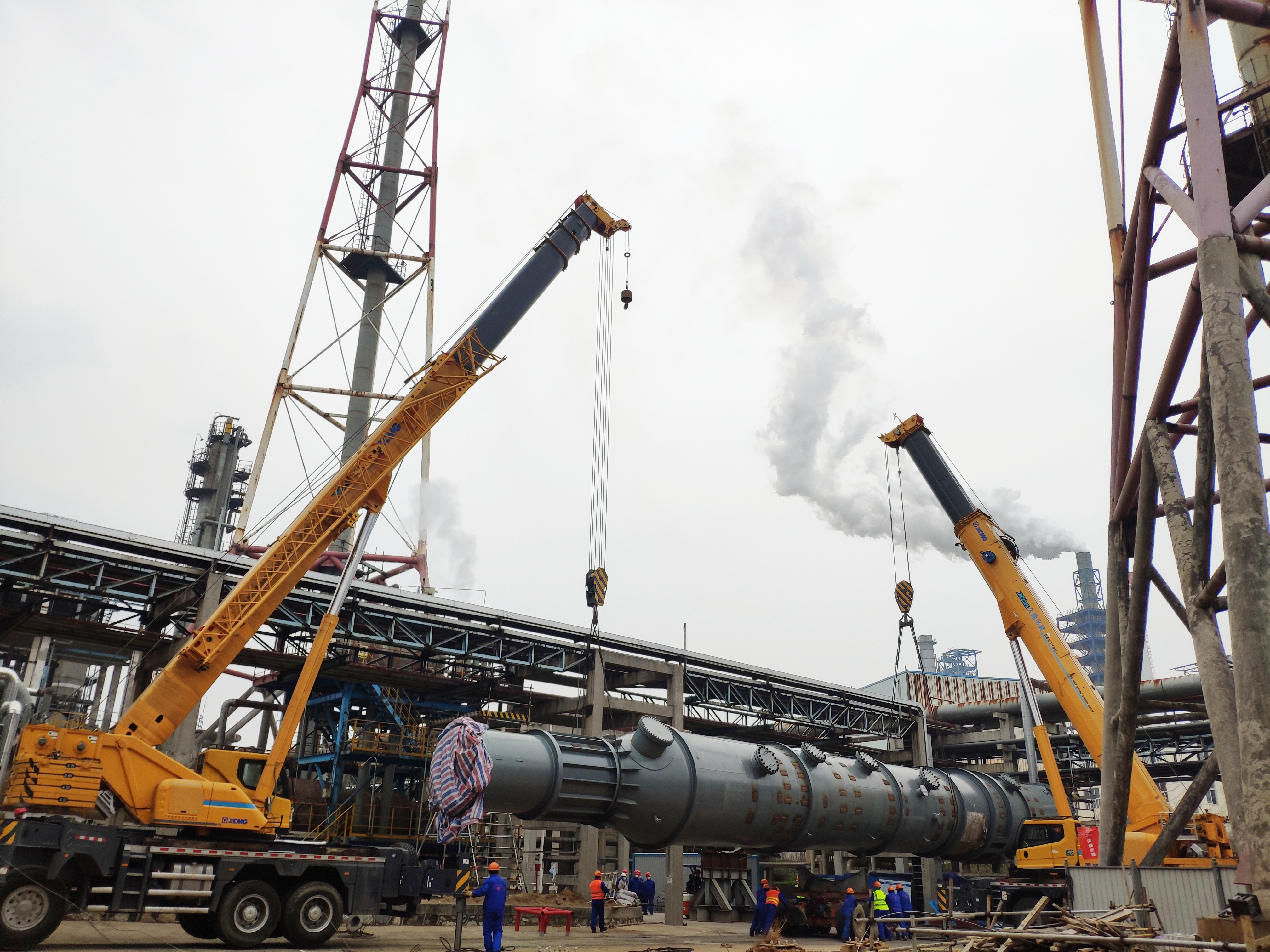 該脫硫塔(ta)設備分為上下兩段(duan)(duan),僅下段(duan)(duan)設備就長達(da)33米,重達(da)58噸(dun),體積十(shi)分龐大,但施工作業(ye)場(chang)地狹(xia)小、固有構(gou)筑(zhu)物(wu)障礙多、吊重(zhong)荷載大等諸多困(kun)難(nan),造成設(she)備無(wu)法一次(ci)性運至(zhi)施工現場(chang)進行“穿(chuan)衣戴(dai)帽”。面對艱巨任務,項目部多次優(you)化倒運方案,提前合理部(bu)署,按照方案采用額定荷載分別為220噸(dun)和(he)90噸(dun)的汽(qi)車吊(diao)實施雙機抬(tai)吊(diao)作(zuo)業(ye)。