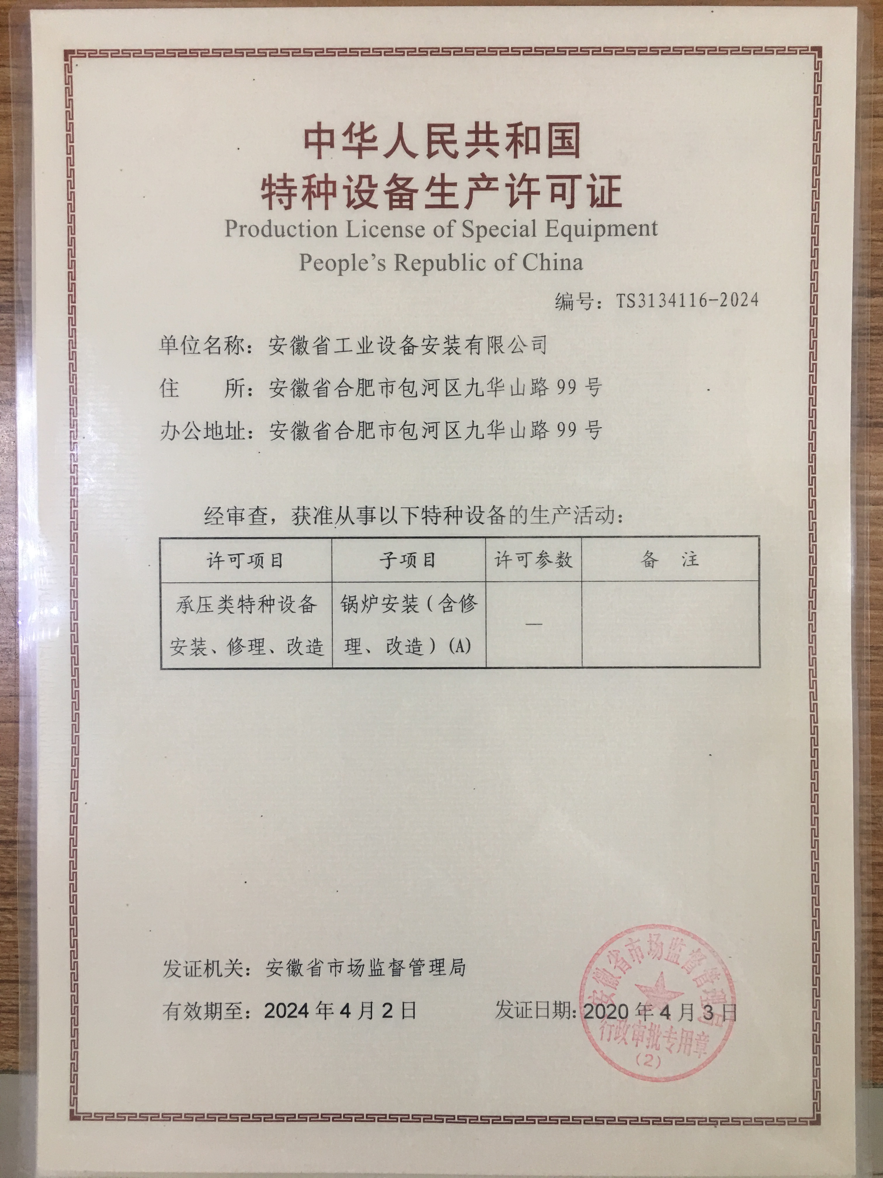2020年4月3日,安徽安裝公司(si)鍋爐(A級)安裝維修(xiu)許可(ke)換證評審順利通過,該(gai)證書由安徽省市場監(jian)督管(guan)理(li)局(ju)發放(fang)。