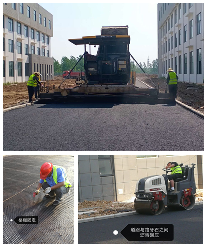 界首出口企業培(pei)育基地(di)工程——瀝(li)(li)青混(hun)凝土面層攤鋪、格柵(zha)固定及路牙(ya)石邊(bian)瀝(li)(li)青碾(nian)壓