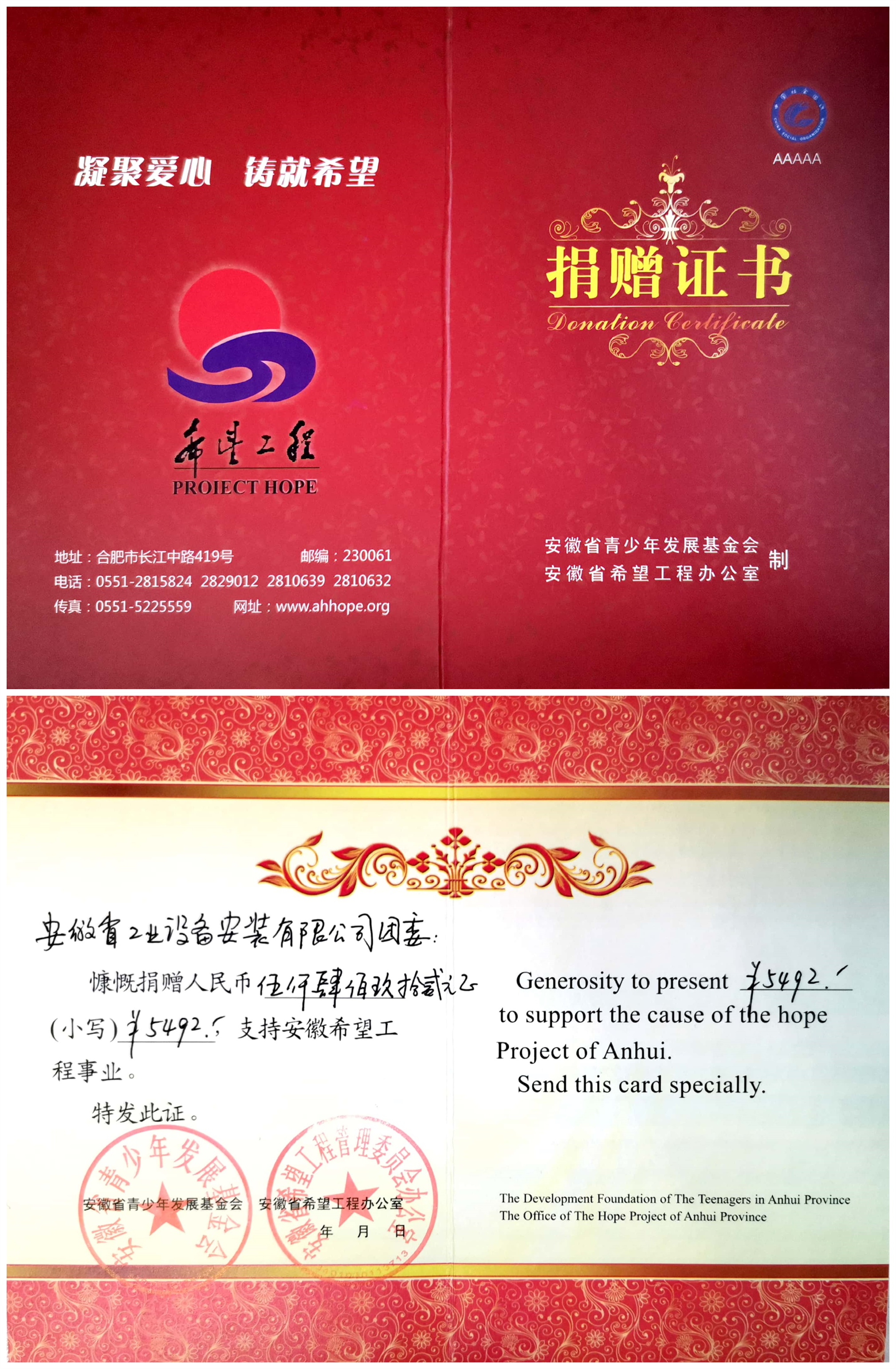 今年的3月(yue)5日是第57個“學雷鋒紀念日(ri)”。近(jin)日(ri),安徽安裝(zhuang)公司團委組織開展了愛心(xin)捐(juan)款活動。此次捐(juan)款得到廣大團員青年熱烈響應,共收到捐(juan)款5492元,目(mu)前已全部捐贈至安徽省青少年發(fa)展基(ji)金會。