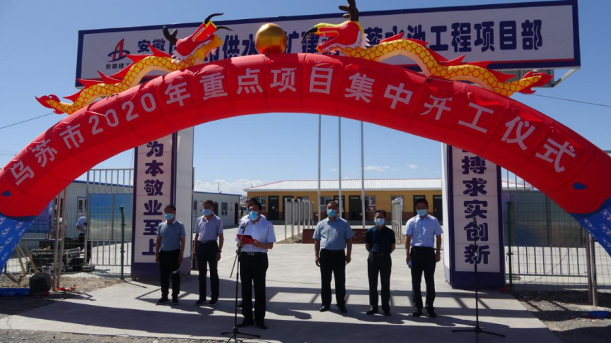 2020年5月28日(ri),烏蘇市(shi)2020年(nian)重點項(xiang)目集中(zhong)開(kai)(kai)工(gong)(gong)儀(yi)式(shi)在烏(wu)蘇市(shi)供水(shui)改擴(kuo)建調節(jie)蓄水(shui)池工(gong)(gong)程項(xiang)目部召(zhao)開(kai)(kai)。塔城(cheng)地區地委委員阿依丁·托留汗,烏(wu)蘇市(shi)政協黨(dang)組書記王永安,烏(wu)蘇市(shi)委常委、常務(wu)副市(shi)長陳(chen)斌,塔城(cheng)地區水(shui)利局、國土(tu)資(zi)源局等相(xiang)關(guan)部門領導及項(xiang)目各參建單位參加開(kai)(kai)工(gong)(gong)儀(yi)式(shi),開(kai)(kai)工(gong)(gong)儀(yi)式(shi)由陳(chen)斌主持。
