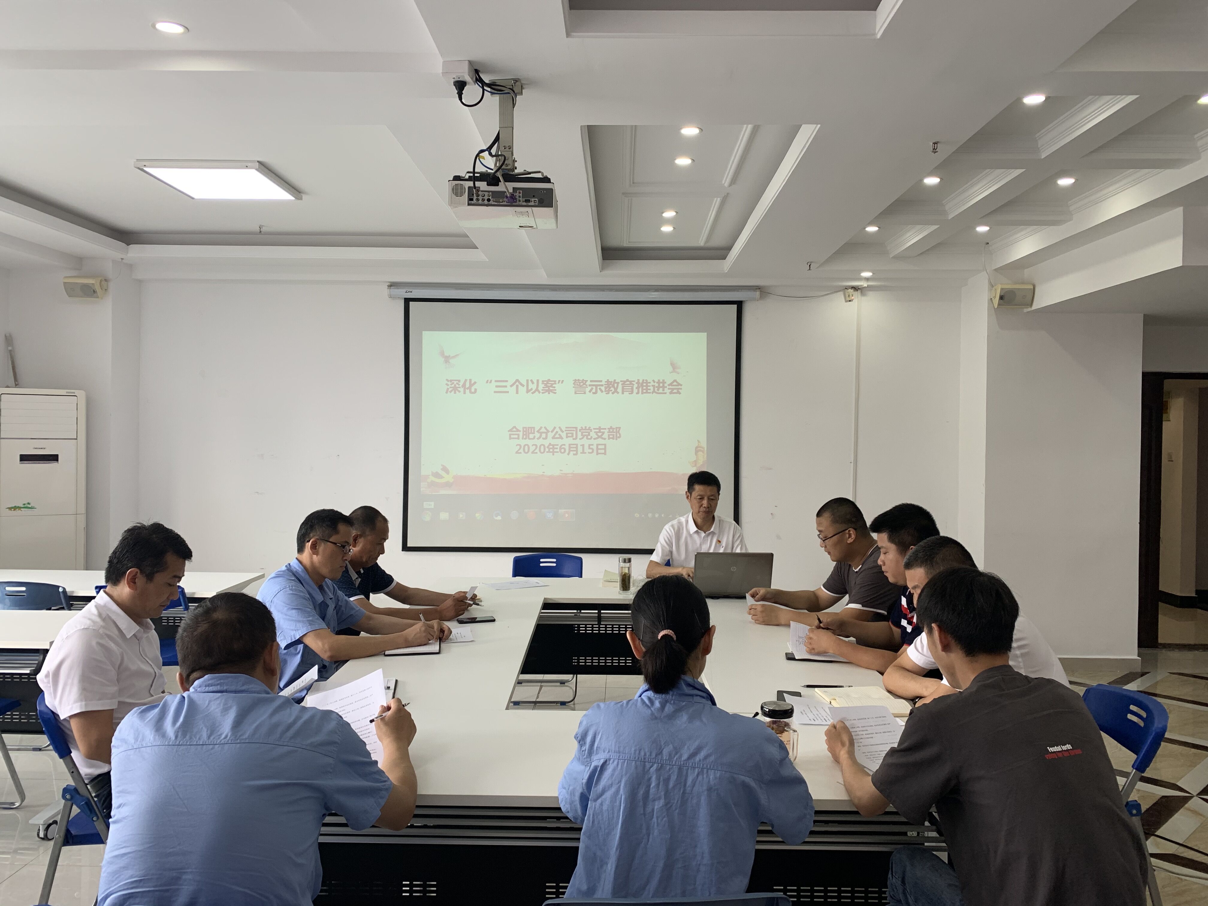 6月15日下(xia)午,合肥分公(gong)司(si)黨(dang)支部召開深化(hua)“三(san)個(ge)以案”警(jing)示(shi)教育推進會,黨(dang)支部書記胡迎東主持(chi)會議。分公(gong)司(si)領(ling)導班(ban)子、機(ji)關全體黨(dang)員參會,項目部黨(dang)員以視頻會議形(xing)式(shi)同(tong)步參加(jia)。