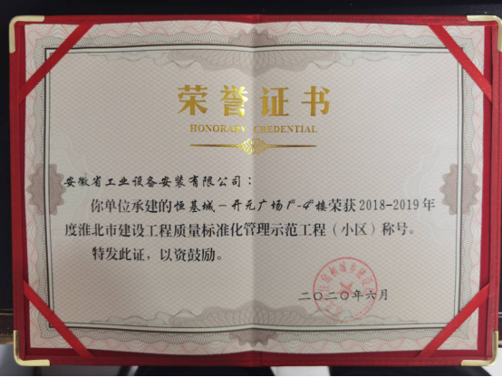 近日,安(an)徽安(an)裝公司承建的淮北(bei)恒基城開(kai)元廣(guang)場項目工程榮獲“2018--2019年度淮北(bei)市建設工程質量標準化(hua)管理示(shi)范工程(小(xiao)區)”稱號。