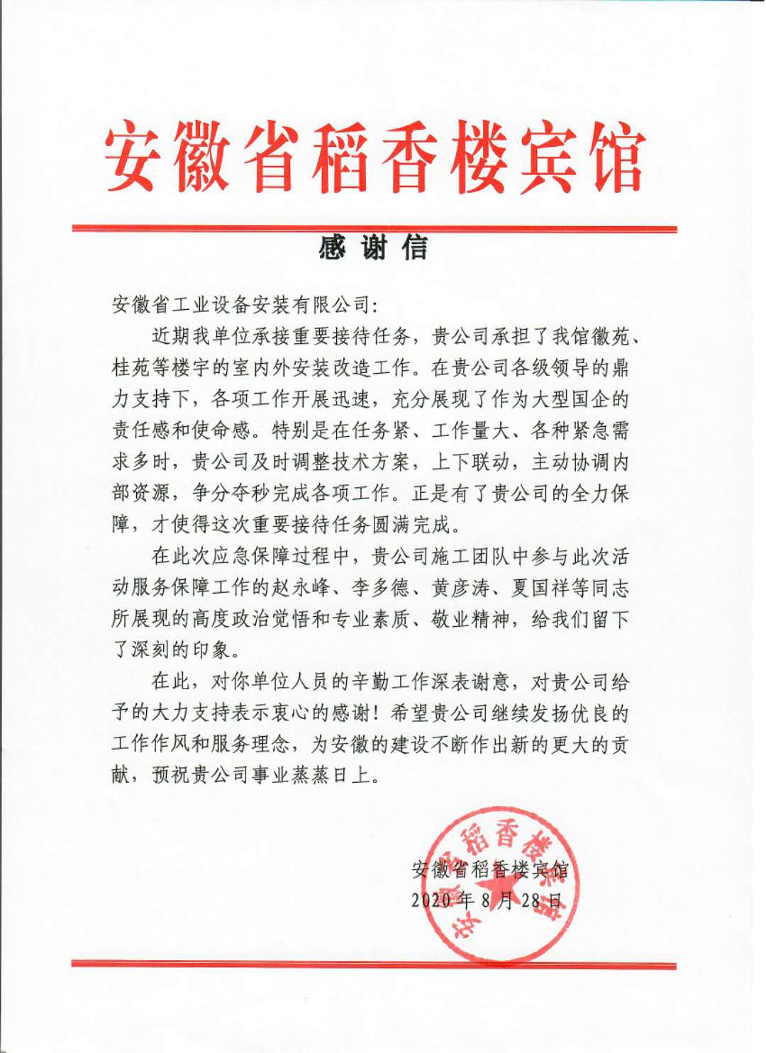 為此(ci),稻(dao)(dao)香樓賓(bin)館(guan)發來的(de)一封感謝信,感謝安徽安裝公司在近期承擔的(de)稻(dao)(dao)香樓賓(bin)館(guan)室內(nei)外安裝改造工(gong)程任務(wu)中,啟動(dong)迅速、保障有力、方(fang)案得當、上下聯(lian)動(dong);通過日夜搶工(gong)奮(fen)戰,爭分奪秒地完成(cheng)各項工(gong)作,充分發揮國企擔當的(de)重任。