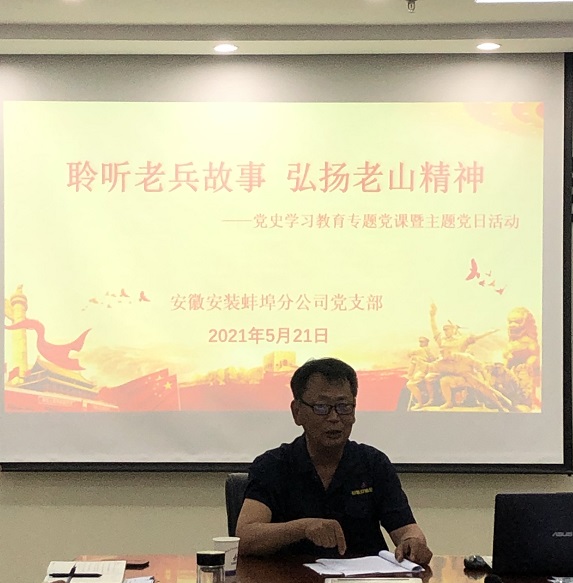 為深(shen)入(ru)開展黨(dang)(dang)史(shi)(shi)學(xue)習教育(yu)活動(dong),進一步引導黨(dang)(dang)員干部學(xue)習黨(dang)(dang)史(shi)(shi)、銘(ming)記黨(dang)(dang)史(shi)(shi),5月(yue)21日下午,蚌埠分公司(si)黨(dang)(dang)支部組織開展了一場“聆聽老(lao)兵(bing)故事(shi) 弘揚老(lao)山精(jing)神”黨(dang)(dang)史(shi)(shi)學(xue)習教育(yu)專題黨(dang)(dang)課(ke)暨主題黨(dang)(dang)日活動(dong)。邀(yao)請曾參加(jia)過(guo)對越自(zi)衛反(fan)擊戰(zhan)的(de)退伍老(lao)兵(bing),分公司(si)在職(zhi)員工年(nian)飛同志為大家上了一堂(tang)別(bie)開生面的(de)黨(dang)(dang)課(ke)。分公司(si)班子成員、項目經理、部門負責(ze)人(ren)及全體黨(dang)(dang)員參會(hui)。