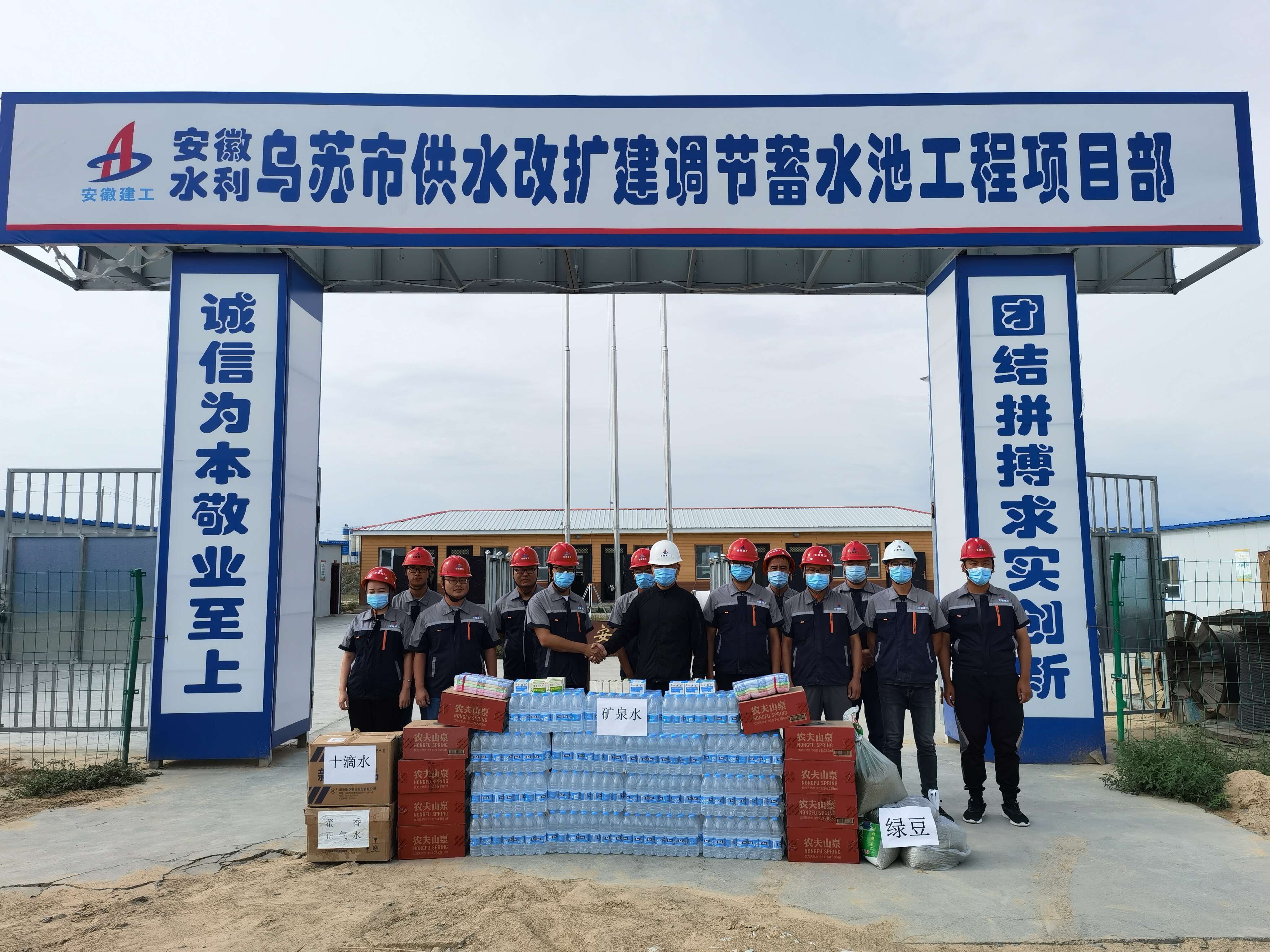 2021年7月(yue)14日上午,公(gong)司副總經理王軍赴(fu)烏蘇市(shi)供(gong)水改(gai)擴建調節蓄(xu)水池項目“送清涼”,將(jiang)礦(kuang)泉水、綠(lv)豆(dou)、冰糖(tang)、藿香(xiang)正氣水、十(shi)滴水、毛巾、香(xiang)皂等(deng)防暑降溫物品(pin)送到(dao)一(yi)線員工手中。