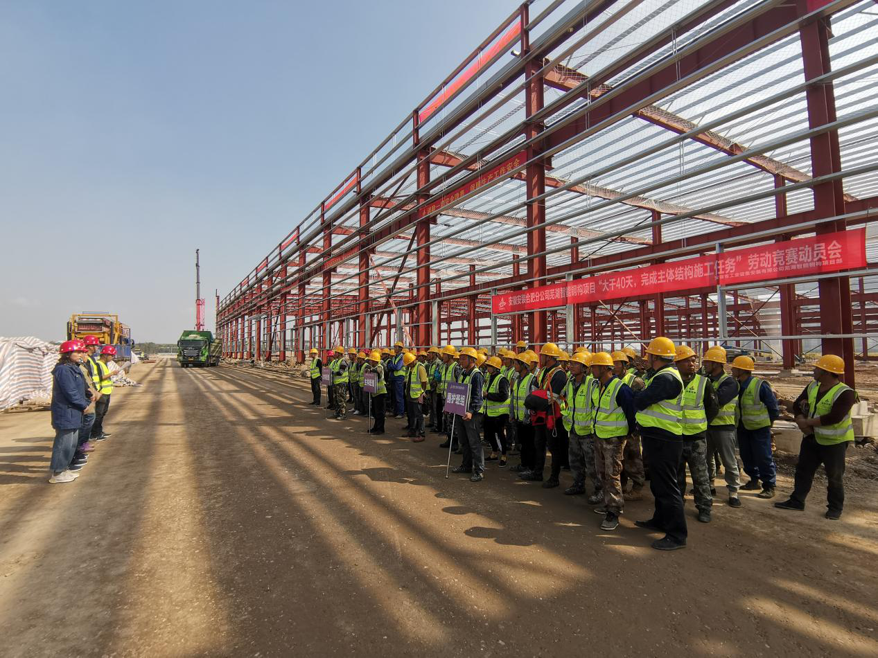 為貫徹落實集團公司(si)“學黨史(shi)、保安(an)康、搶(qiang)工(gong)(gong)期、爭一流(liu)、沖千億”勞動(dong)競(jing)賽(sai)活(huo)動(dong)精神,10月29日上午,安(an)徽安(an)裝合肥分公司(si)建工(gong)(gong)智能鋼構項(xiang)(xiang)目舉行“大干(gan)40天,完成主次構施工(gong)(gong)任務”勞動(dong)競(jing)賽(sai)動(dong)員(yuan)會,公司(si)紀(ji)委副書記、工(gong)(gong)會副主席(xi)王敏出席(xi),合肥分公司(si)副經理(li)夏國祥(xiang)、工(gong)(gong)會副主席(xi)杜(du)瓊、項(xiang)(xiang)目管理(li)人員(yuan)及(ji)勞務班組參加會議(yi)。