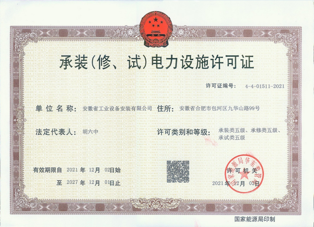 近日,安(an)徽安(an)裝(zhuang)公司申報的承裝(zhuang)(修、試(shi))電(dian)力設(she)施許(xu)可證資質成功獲(huo)批。