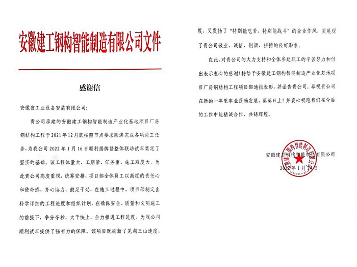 信中表示(shi),安(an)徽建工(gong)(gong)鋼構(gou)智能制(zhi)造有限公司(si)廠房鋼結構(gou)工(gong)(gong)程自開工(gong)(gong)以來,科學制(zhi)定(ding)施工(gong)(gong)生產計(ji)劃,項目部全(quan)體(ti)員工(gong)(gong)以高(gao)度的(de)(de)(de)責任心(xin)、使(shi)命(ming)感,齊心(xin)協力(li),鼓足干勁,在確(que)保安(an)全(quan)、質量和(he)文(wen)明施工(gong)(gong)的(de)(de)(de)前提下,爭分(fen)奪秒(miao),大干快(kuai)上(shang),全(quan)力(li)推進(jin)工(gong)(gong)程進(jin)度。最終在2021年12月(yue)底前按照節點要求圓滿完(wan)成各項施工(gong)(gong)任務,為業主單位順利(li)揭牌(pai)暨整體(ti)聯動(dong)試車(che)成功提供了強(qiang)有力(li)的(de)(de)(de)保障,展現(xian)了敬業、誠信、創新、拼(pin)搏的(de)(de)(de)良好形象。