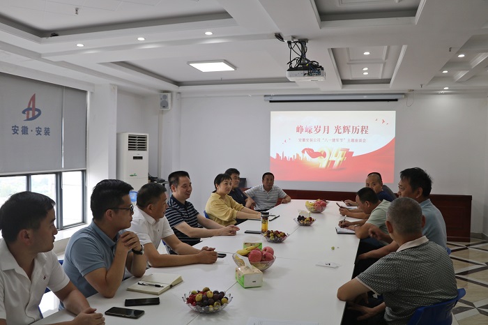 2021年(nian)8月(yue)(yue)1日(ri)是中(zhong)國人民解放軍(jun)建軍(jun)94周年(nian),8月(yue)(yue)2日(ri),安徽安裝(zhuang)公(gong)司組織召開了(le)“八一”建軍(jun)節主題座談(tan)會(hui)(hui)。座談(tan)會(hui)(hui)由公(gong)司工會(hui)(hui)副(fu)主席、人力資源部經理王敏主持,黨委(wei)書記、董事(shi)長(chang)胡六中(zhong)出席,10名(ming)公(gong)司在職(zhi)的(de)退伍軍(jun)人參加(jia)了(le)座談(tan)會(hui)(hui)。