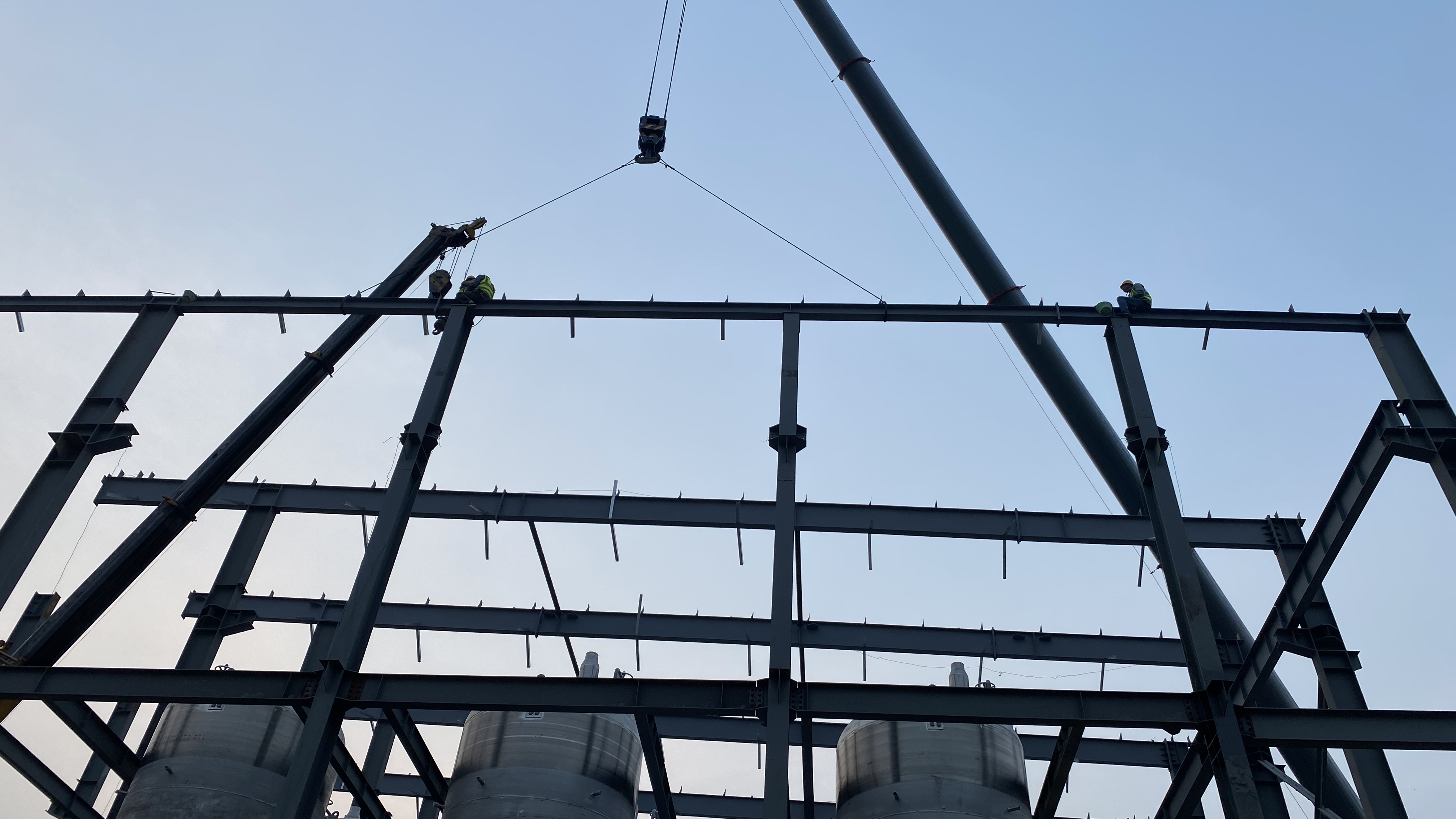 發(fa)酵車間(jian)吊(diao)車大臂高展,C區鋼(gang)結構工(gong)程鋼(gang)梁安裝正在進(jin)行(xing),司索工(gong)鋼(gang)梁綁扎穩固后(hou),現場信號(hao)工(gong)發(fa)出清(qing)晰信號(hao),經驗豐富的(de)(de)司機操(cao)控(kong)著吊(diao)車將鋼(gang)梁緩緩升(sheng)起,20米(mi)的(de)(de)高空上,兩(liang)名安全防護的(de)(de)工(gong)人等待著鋼(gang)梁靠近,停穩、就(jiu)(jiu)位、穩固、矯正、固定...一道(dao)道(dao)鋼(gang)梁就(jiu)(jiu)這樣(yang)架(jia)起,發(fa)酵車間(jian)的(de)(de)金屬骨(gu)架(jia)就(jiu)(jiu)這樣(yang)拔(ba)地而起,逐步(bu)形成。