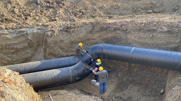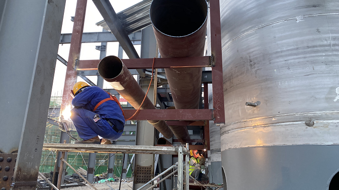 工(gong)(gong)(gong)藝管(guan)道(dao)(dao)班組也在忙忙碌碌,壓縮(suo)空(kong)氣管(guan)道(dao)(dao)在不斷架設,料場加工(gong)(gong)(gong)好(hao)的(de)管(guan)道(dao)(dao)在吊車(che)、葫蘆的(de)牽引(yin)下(xia)就位,專(zhuan)業(ye)的(de)焊工(gong)(gong)(gong)進行焊接,慢工(gong)(gong)(gong)出細活,保證每一道(dao)(dao)焊口符合規范(fan)要求(qiu),室外的(de)循環(huan)水管(guan)也在與老廠(chang)的(de)接口緊張對接。