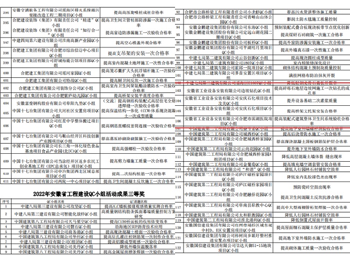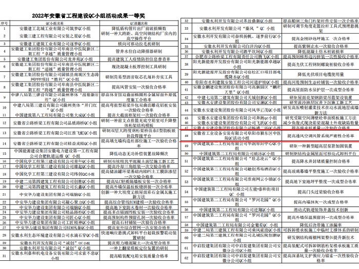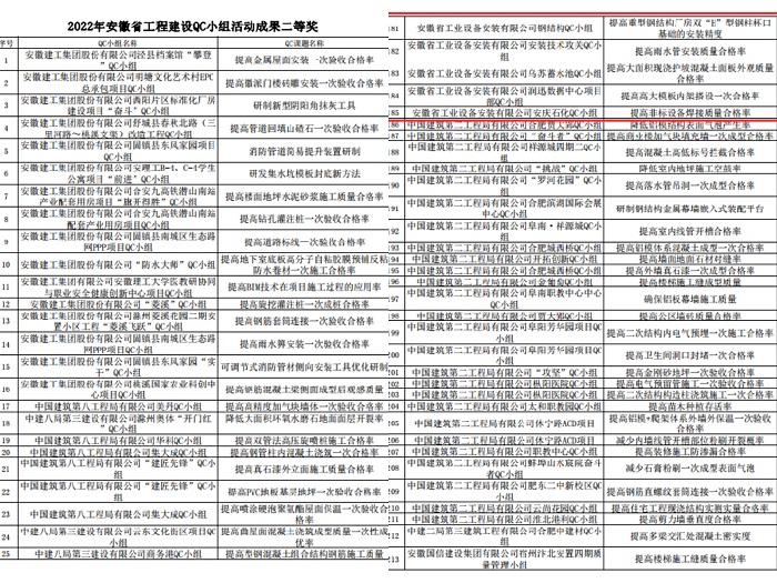 其中安(an)(an)(an)(an)徽(hui)(hui)(hui)(hui)(hui)安(an)(an)(an)(an)裝公司(si)阜陽市潁東區中醫院(yuan)QC活(huo)動(dong)(dong)小(xiao)組(zu)(zu)(zu)(zu)完成(cheng)(cheng)(cheng)(cheng)的(de)《提高(gao)通(tong)風(feng)空調風(feng)管系統嚴密性合格率》榮獲(huo)2022年(nian)(nian)安(an)(an)(an)(an)徽(hui)(hui)(hui)(hui)(hui)省工程建(jian)(jian)設(she)QC小(xiao)組(zu)(zu)(zu)(zu)活(huo)動(dong)(dong)成(cheng)(cheng)(cheng)(cheng)果(guo)(guo)一等獎。安(an)(an)(an)(an)徽(hui)(hui)(hui)(hui)(hui)安(an)(an)(an)(an)裝公司(si)安(an)(an)(an)(an)徽(hui)(hui)(hui)(hui)(hui)省安(an)(an)(an)(an)暖通(tong)QC攻關(guan)小(xiao)組(zu)(zu)(zu)(zu)完成(cheng)(cheng)(cheng)(cheng)的(de)《提高(gao)不銹(xiu)鋼(gang)空調供(gong)回水管質量(liang)(liang)合格率》、鋼(gang)結(jie)構(gou)QC小(xiao)組(zu)(zu)(zu)(zu)完成(cheng)(cheng)(cheng)(cheng)的(de)《提高(gao)重型鋼(gang)結(jie)構(gou)廠房雙(shuang)“H”型鋼(gang)柱杯口基礎的(de)安(an)(an)(an)(an)裝精度》等六(liu)項(xiang)課題(ti)榮獲(huo)2022年(nian)(nian)安(an)(an)(an)(an)徽(hui)(hui)(hui)(hui)(hui)省工程建(jian)(jian)設(she)QC小(xiao)組(zu)(zu)(zu)(zu)活(huo)動(dong)(dong)成(cheng)(cheng)(cheng)(cheng)果(guo)(guo)二等獎。安(an)(an)(an)(an)徽(hui)(hui)(hui)(hui)(hui)安(an)(an)(an)(an)裝公司(si)公司(si)邊坡(po)(po)鉆孔QC小(xiao)組(zu)(zu)(zu)(zu)完成(cheng)(cheng)(cheng)(cheng)的(de)《提高(gao)碎礫石地層邊坡(po)(po)網施工一次鉆孔的(de)成(cheng)(cheng)(cheng)(cheng)孔率》、安(an)(an)(an)(an)慶(qing)石化項(xiang)目技術攻關(guan)QC小(xiao)組(zu)(zu)(zu)(zu)完成(cheng)(cheng)(cheng)(cheng)的(de)《提升設(she)備(bei)基礎二次灌漿質量(liang)(liang)》等四項(xiang)課題(ti)榮獲(huo)2022年(nian)(nian)安(an)(an)(an)(an)徽(hui)(hui)(hui)(hui)(hui)省工程建(jian)(jian)設(she)QC小(xiao)組(zu)(zu)(zu)(zu)活(huo)動(dong)(dong)成(cheng)(cheng)(cheng)(cheng)果(guo)(guo)三等獎。