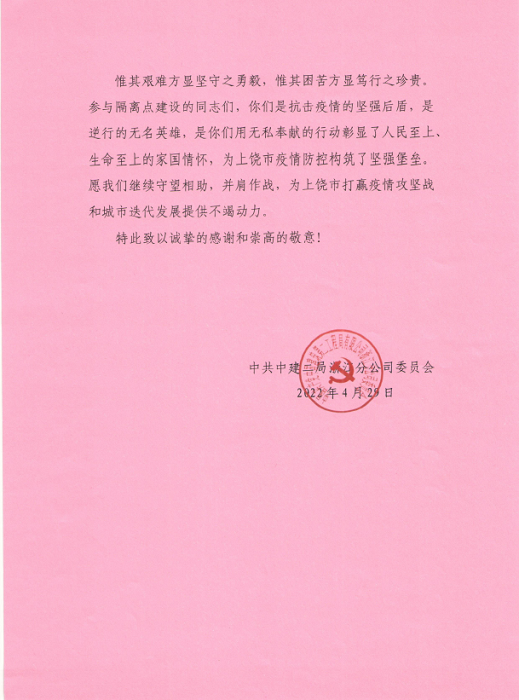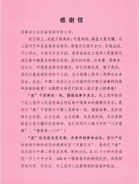 信中(zhong)對安徽安裝公司與(yu)中(zhong)建(jian)(jian)二(er)局浙(zhe)江分公司共同(tong)(tong)援建(jian)(jian)上饒(rao)市人民(min)醫院(yuan)北城區集中(zhong)隔離點給(gei)予高度的肯(ken)定(ding)和認可。當前,新冠疫情(qing)形(xing)勢(shi)嚴峻,安徽安裝公司在(zai)嚴格落實(shi)屬(shu)地疫情(qing)防(fang)控措(cuo)施的同(tong)(tong)時,一方面積(ji)極(ji)參與(yu)本地區隔離點、醫院(yuan)發(fa)熱門診的緊急建(jian)(jian)設(she)(she)任務;另一方面攜(xie)手(shou)相關行業(ye)兄弟單位同(tong)(tong)心協力、援建(jian)(jian)市外防(fang)疫區域,承擔起國有企業(ye)社會責任,竭盡所能地為(wei)防(fang)疫建(jian)(jian)設(she)(she)貢獻最大的力量!