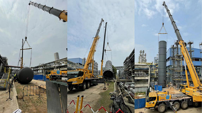 現(xian)場從(cong)8時10分開始進行吊裝準備(bei)(bei)工(gong)作,歷經一個半小時的準備(bei)(bei),解析氣緩沖罐終于(yu)達(da)到了起吊要求(qiu)。