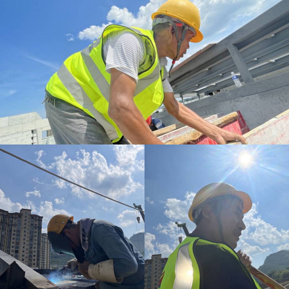合(he)肥分公司岳西(xi)恒(heng)泰城項目(mu)一線工(gong)人頂(ding)著(zhu)38度高(gao)溫,揮汗(han)如雨默默奉獻(xian);圖為(wei)模(mo)板安裝(zhuang)、焊(han)接(jie)作(zuo)業(ye)及(ji)混凝土澆筑(zhu)施(shi)工。