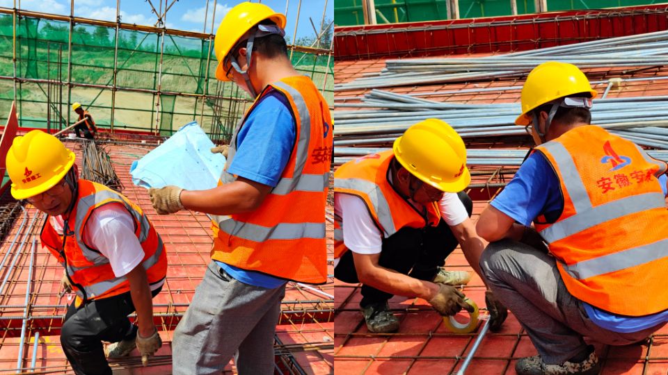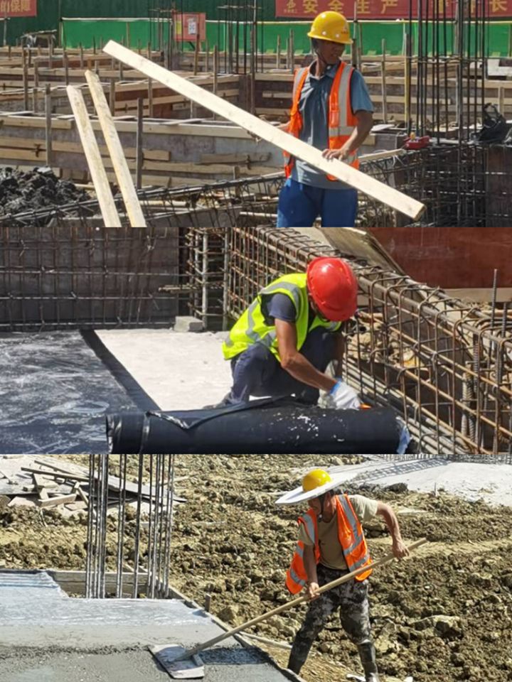 合肥分公司肥西(xi)安(an)信立士項目一線(xian)工人在熱(re)浪(lang)滾滾中堅(jian)守崗位;圖為木工支(zhi)模、貼防水卷材及地坪抹平(ping)施工。