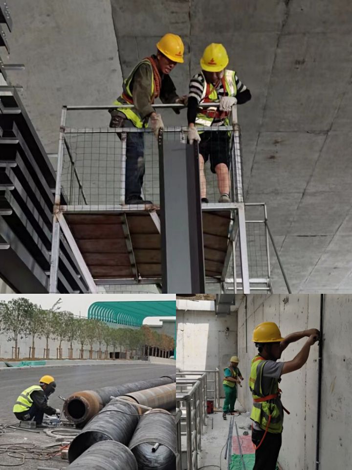 合肥分公司花園大道項目一線工(gong)人不(bu)遺余力苦(ku)干(gan)實干(gan),汗(han)水和膚色就是最好(hao)的見證;圖為隧道內橋架安裝、管道預制焊(han)接及雨水泵房電氣配(pei)管施(shi)工(gong)。