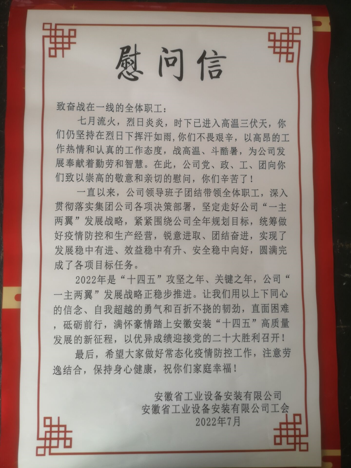 隨后在(zai)項(xiang)(xiang)目(mu)部會議室,李(li)楊對集團和(he)公司兩級“十四五”發展戰(zhan)略與(yu)規(gui)劃進(jin)行了宣貫(guan)解讀。隨后代表公司向奮戰(zhan)在(zai)一(yi)線的項(xiang)(xiang)目(mu)部員(yuan)工表示慰問和(he)感謝,送來了防(fang)暑降(jiang)溫慰問品和(he)慰問信,并與(yu)項(xiang)(xiang)目(mu)部員(yuan)工進(jin)行了親切交(jiao)談。在(zai)談話(hua)中(zhong),李(li)楊鼓勵項(xiang)(xiang)目(mu)部青(qing)年(nian)員(yuan)工和(he)新大學生要樹(shu)立好(hao)正(zheng)確的世(shi)界觀(guan)、人生觀(guan)和(he)價值觀(guan),在(zai)工作中(zhong)找準(zhun)定位,不斷提升業(ye)務能力,將(jiang)個人的進(jin)步(bu)與(yu)企業(ye)的發展緊密(mi)地結合在(zai)一(yi)起,與(yu)企業(ye)共同成長(chang)。