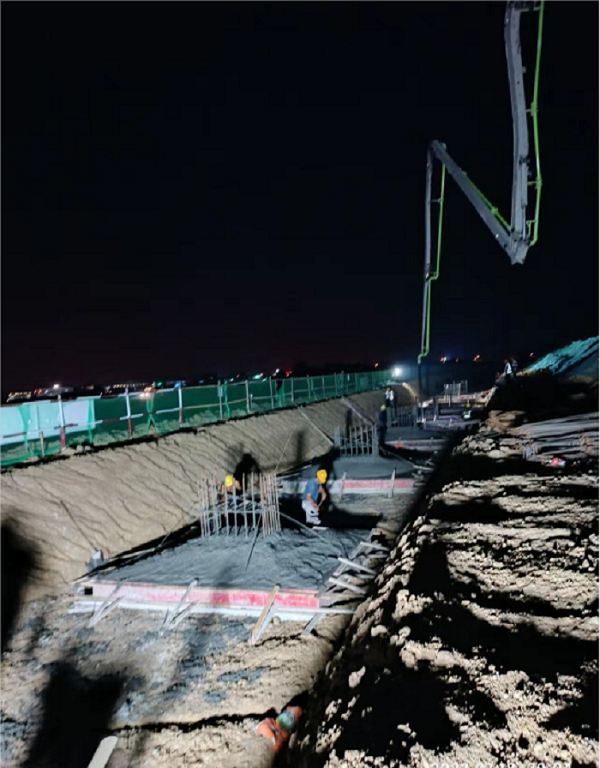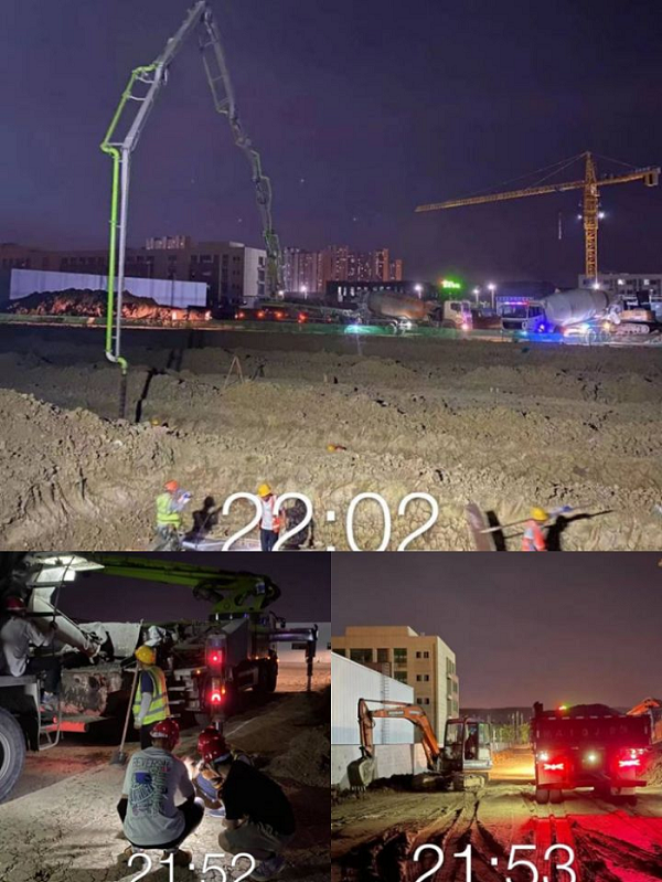 圖(tu)為夜間安徽建(jian)(jian)工(gong)交通智造基地(di)建(jian)(jian)設項目鋼(gang)結構承臺混凝(ning)土澆(jiao)筑(zhu)場景