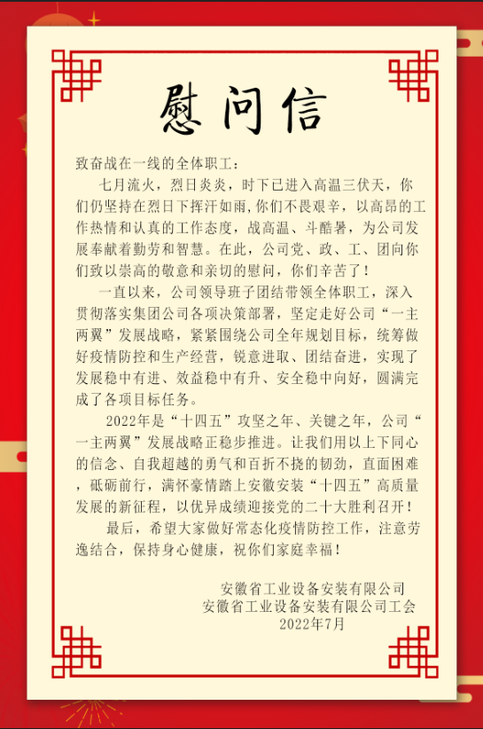為做(zuo)好(hao)高(gao)溫(wen)(wen)季節勞動保護和(he)防暑降溫(wen)(wen)工作,保障(zhang)高(gao)溫(wen)(wen)天氣始終堅持在(zai)一線崗(gang)位員(yuan)工的身(shen)體健康(kang)。7月-8月,安(an)徽安(an)裝(zhuang)公司工會結合職工代表(biao)巡察,到分公司在(zai)建項目開展“送清涼”活動,親切慰問施工一線員(yuan)工,并(bing)為他們送去清涼和(he)關(guan)愛(ai)。