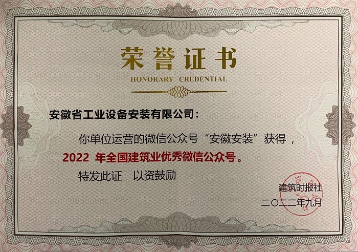 9月25日,由建(jian)筑(zhu)時報社(she)主辦的2022年建(jian)筑(zhu)業微(wei)信公(gong)眾(zhong)號(hao)(hao)運維經驗交流研(yan)討會暨全(quan)國建(jian)筑(zhu)業優秀微(wei)信公(gong)眾(zhong)號(hao)(hao)頒獎(jiang)典(dian)禮在武漢召開(kai)。公(gong)司微(wei)信公(gong)眾(zhong)號(hao)(hao)“安(an)徽安(an)裝”榮獲“2022年全(quan)國建(jian)筑(zhu)業優秀微(wei)信公(gong)眾(zhong)號(hao)(hao)”榮譽。