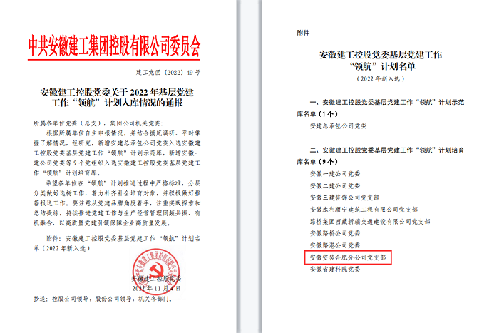 經(jing)過(guo)前期充分準備以及集團嚴格(ge)篩(shai)選(xuan)(xuan)(xuan)研究,安徽安裝合肥分公(gong)司黨(dang)(dang)支(zhi)部(bu)于近日(ri)成功入(ru)選(xuan)(xuan)(xuan)集團基層黨(dang)(dang)建(jian)工作“領(ling)航”計劃(hua)(hua)培育庫(ku)。下一(yi)步,合肥分公(gong)司黨(dang)(dang)支(zhi)部(bu)將以此為契(qi)機,注重實踐探索和總結提煉(lian),大力(li)開展(zhan)黨(dang)(dang)建(jian)品牌(pai)建(jian)設,并充分發揮榜樣示范作用,帶動更多的黨(dang)(dang)支(zhi)部(bu)能(neng)有(you)機會入(ru)選(xuan)(xuan)(xuan)“領(ling)航”計劃(hua)(hua)培育庫(ku),持(chi)續推(tui)進公(gong)司黨(dang)(dang)建(jian)工作與生(sheng)產經(jing)營管理同頻共振、有(you)機融合,以高(gao)質(zhi)量黨(dang)(dang)建(jian)引(yin)領(ling)保障企業高(gao)質(zhi)量發展(zhan)。