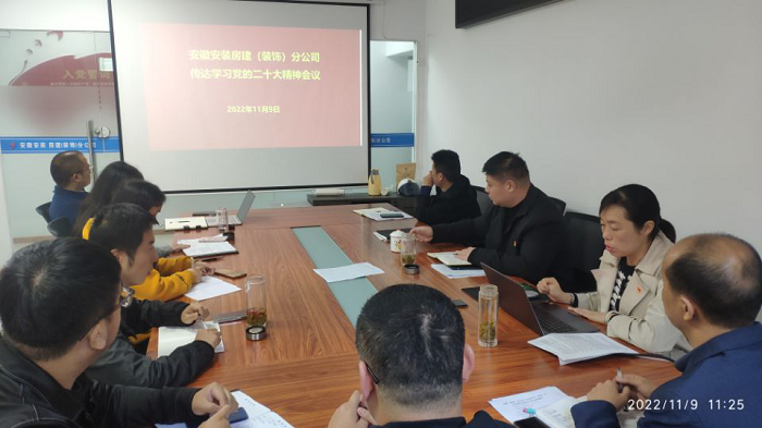 11月9日上午,房(fang)建(裝飾(shi))分(fen)公司黨(dang)支(zhi)部組(zu)織全體黨(dang)員(yuan)、機(ji)關干部職工(gong)、在肥項目經(jing)理召開學習宣貫(guan)黨(dang)的二(er)十大精神專題會議。會議由支(zhi)部書記程茂麗主持。