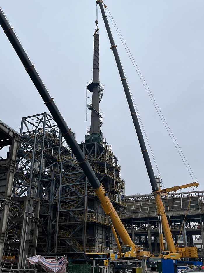 該項目(mu)原有煙囪(cong)吊(diao)(diao)(diao)(diao)耳(er)主(zhu)軸低于規范要求(qiu),存在(zai)安全隱患,因(yin)此在(zai)本次檢修期間重新制作并利用吊(diao)(diao)(diao)(diao)籠在(zai)高(gao)空(kong)焊接(jie)安裝吊(diao)(diao)(diao)(diao)耳(er)。該煙囪(cong)及附件(jian)整體重約50噸,設備位于25米框架頂,煙囪(cong)長(chang)35米,煙囪(cong)頂部距(ju)地面60米,受施工空(kong)間影響,采用動(dong)態施工的組(zu)織方法,利用500T吊(diao)(diao)(diao)(diao)車(che)主(zhu)吊(diao)(diao)(diao)(diao)與130T吊(diao)(diao)(diao)(diao)車(che)溜(liu)尾、高(gao)空(kong)組(zu)對焊接(jie)及分段吊(diao)(diao)(diao)(diao)裝等技術確保該煙囪(cong)順利吊(diao)(diao)(diao)(diao)裝。