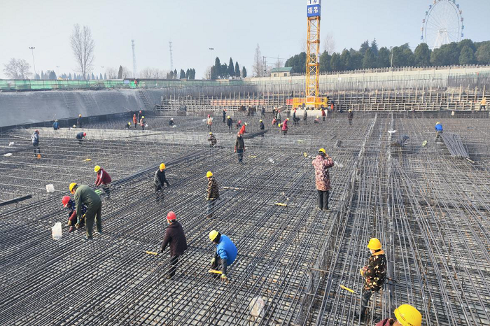 圖為施工現場水解酸化池筏板(ban)鋼筋綁扎