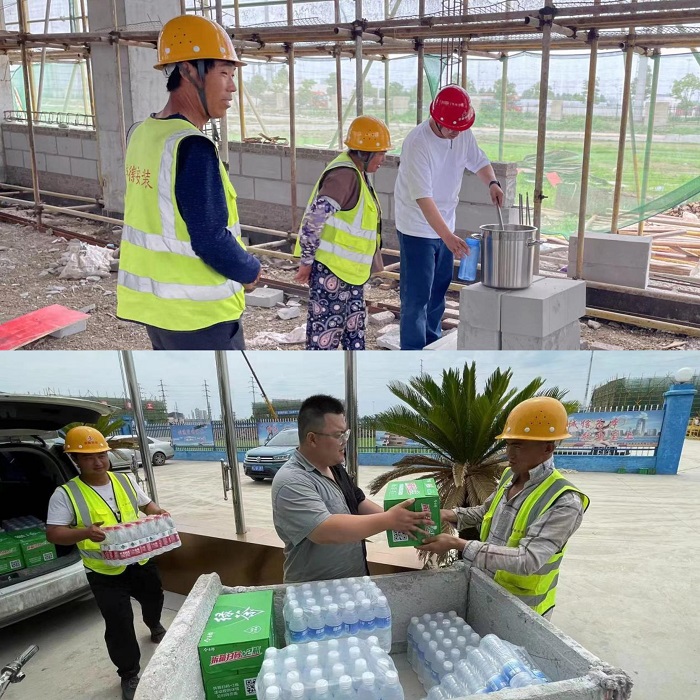 為應(ying)對高溫天(tian)氣(qi)安全(quan)(quan)施工(gong),項(xiang)目(mu)部提前制(zhi)定(ding)防(fang)暑降(jiang)溫工(gong)作方案,管理(li)人(ren)(ren)員(yuan)在現場設置納涼(liang)棚為工(gong)人(ren)(ren)提供休(xiu)息(xi)場地,針對高溫天(tian)氣(qi),采取干兩頭避中間,利用(yong)夜晚加班等方式全(quan)(quan)力推進施工(gong)進度。同時項(xiang)目(mu)后勤保障人(ren)(ren)員(yuan)在高溫時段提供礦泉水、綠茶等清(qing)(qing)涼(liang)解(jie)暑飲(yin)品,并持續每(mei)天(tian)熬制(zhi)綠豆湯分發至各(ge)班組,為每(mei)位員(yuan)工(gong)帶(dai)來絲絲清(qing)(qing)涼(liang)。項(xiang)目(mu)安全(quan)(quan)科備足(zu)人(ren)(ren)丹、藿香正氣(qi)液、十滴水、清(qing)(qing)涼(liang)油、風油精等防(fang)暑降(jiang)溫用(yong)品,做(zuo)好(hao)高溫天(tian)氣(qi)施工(gong)保障,確保施工(gong)安全(quan)(quan)、高效、有序推進。