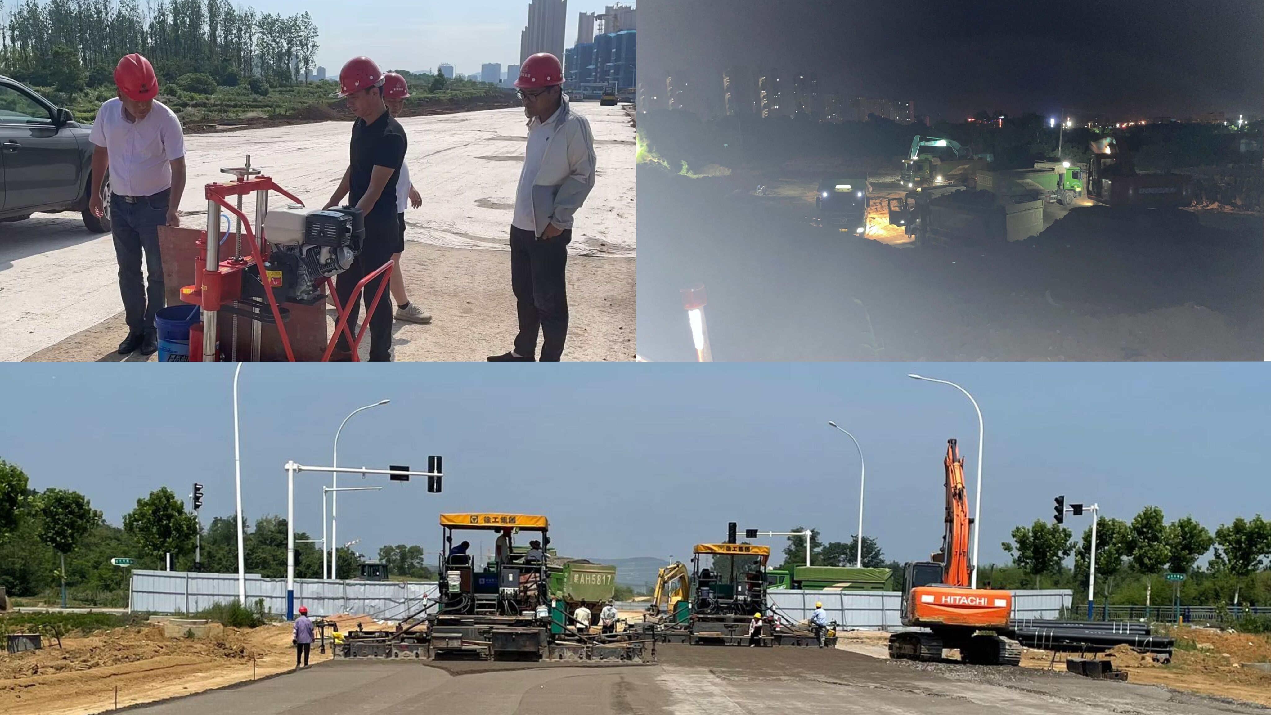 圖為:廬江縣新建(jian)立人路(福(fu)泉路-城西大(da)道)工(gong)程水(shui)穩(wen)取芯(xin)試驗、土方(fang)夜間外運及快車(che)道水(shui)穩(wen)攤鋪碾壓(ya)施工(gong)
