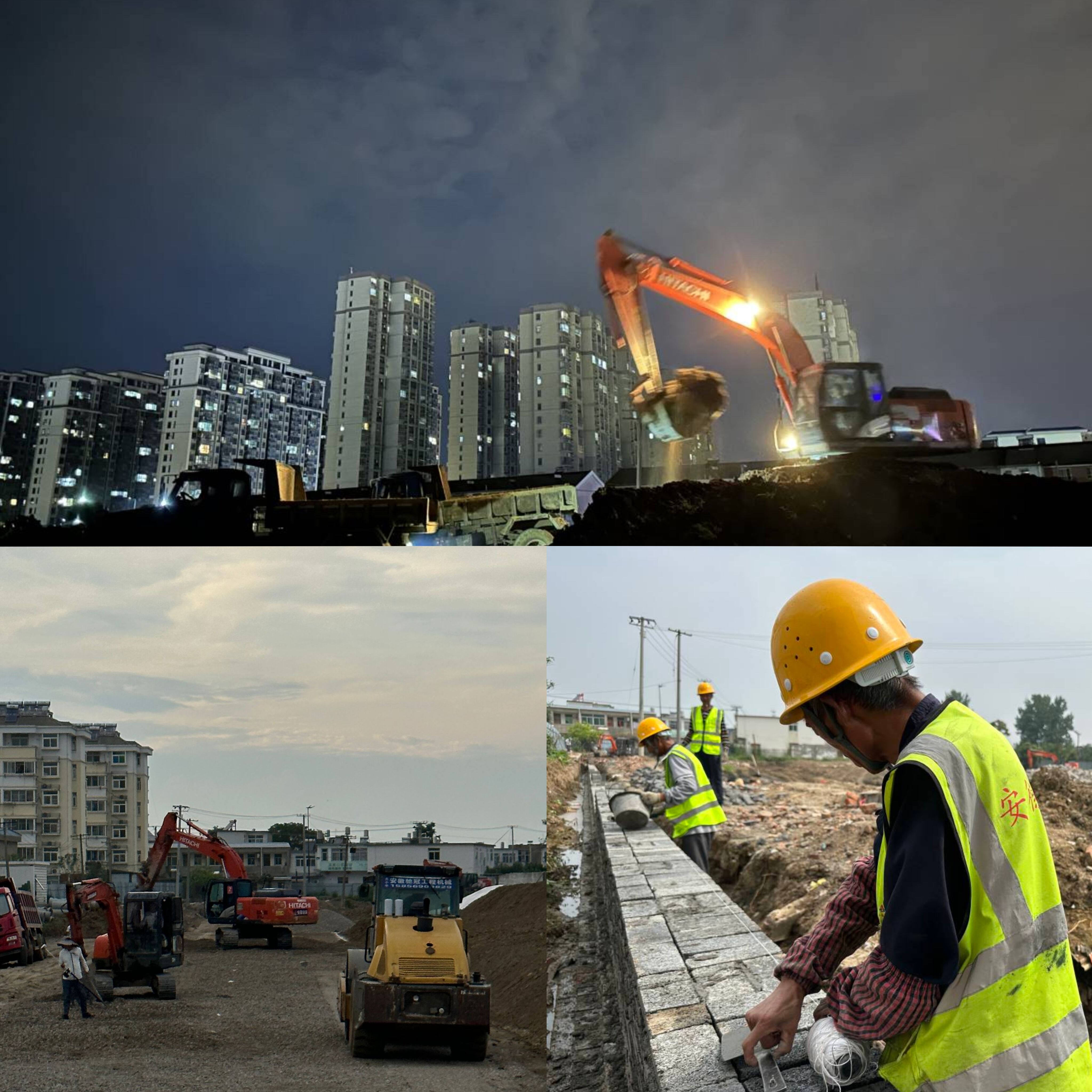 圖為:神道改造停車場及周(zhou)邊綠化提升工(gong)程土方夜間運輸(shu)、道路(lu)級配(pei)碎石(shi)攤(tan)鋪壓實及道路(lu)圍墻基(ji)礎砌筑施工(gong)