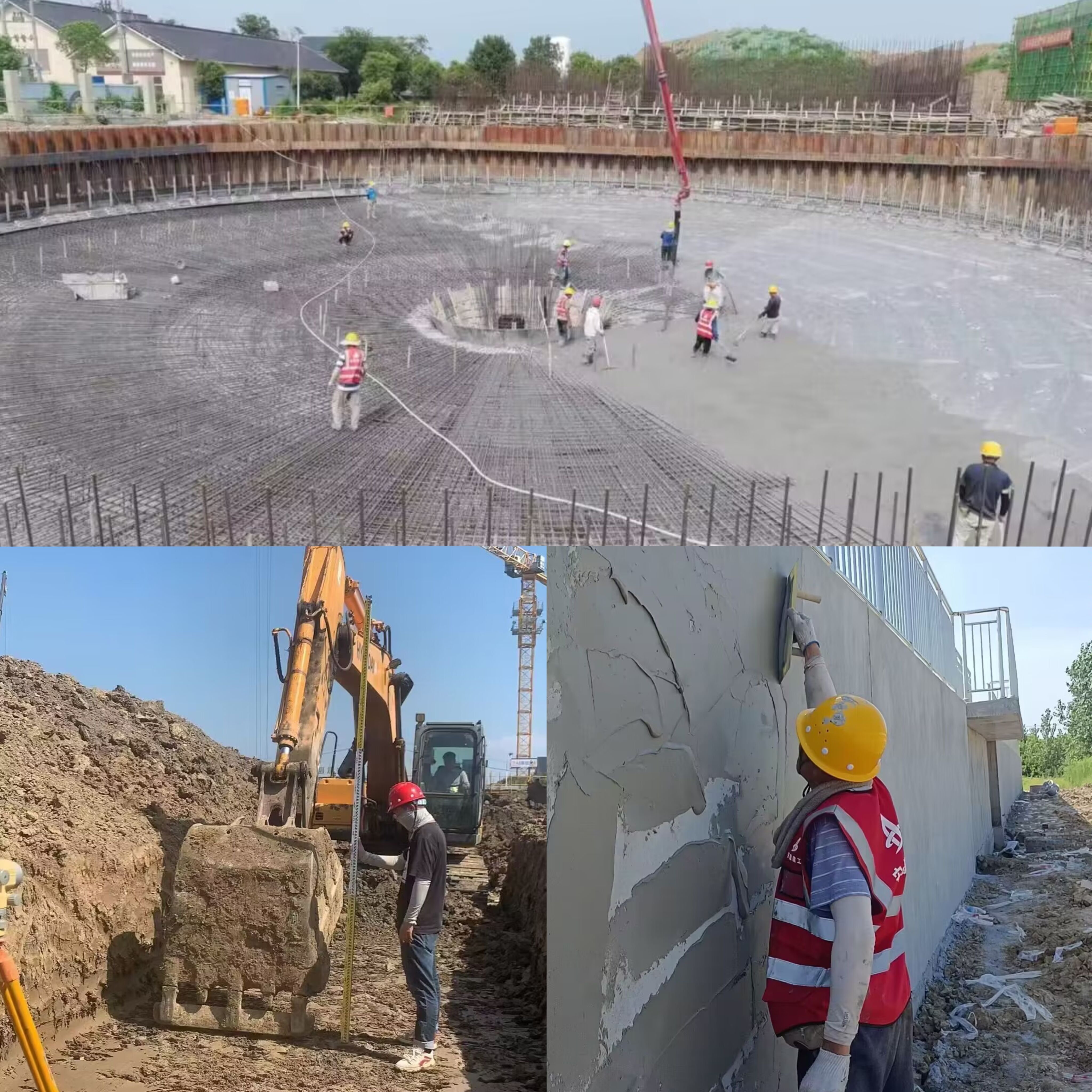 圖(tu)為(wei):阜南城(cheng)南污水處(chu)理廠改擴(kuo)建(jian)及(ji)配套管網工程二(er)沉池(chi)筏板混凝土澆筑、配電房(fang)基礎(chu)開挖及(ji)均(jun)質池(chi)外(wai)墻粉刷施工