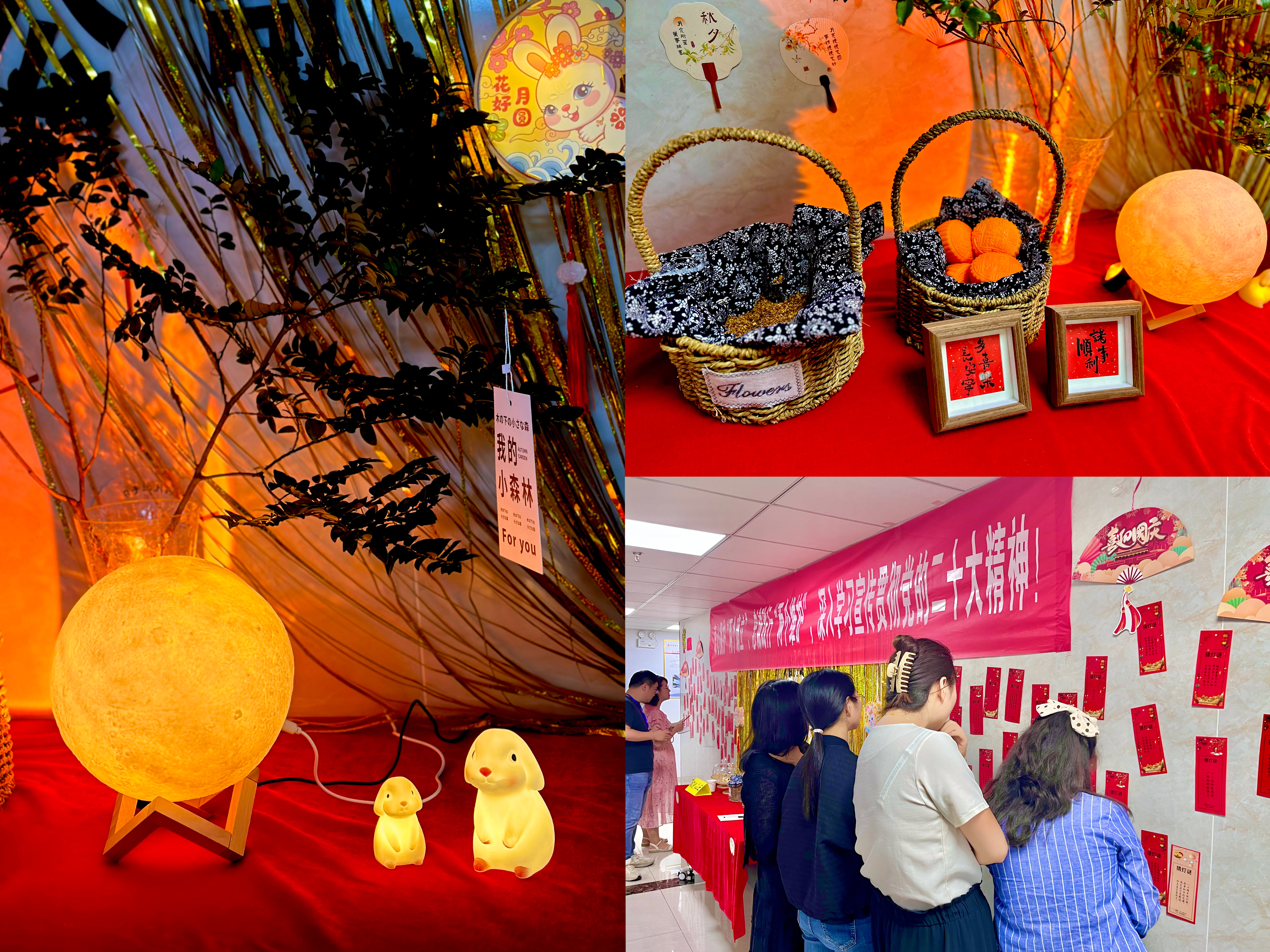 分公司工(gong)會(hui)購(gou)置月亮燈(deng)(deng)、玉(yu)桂(gui)兔、綠植、桂(gui)花籃(lan)、燈(deng)(deng)籠、貼(tie)畫等各(ge)種裝(zhuang)飾(shi)物,把整(zheng)個分公司裝(zhuang)扮(ban)得喜慶(qing)又熱鬧,擺(bai)放各(ge)式月餅、綠豆糕等供大(da)家品嘗(chang)。舉辦“猜燈(deng)(deng)謎(mi)”小游戲(xi),在分公司背景墻(qiang)貼(tie)上“燈(deng)(deng)謎(mi)”小卡片,大(da)家紛紛駐(zhu)足觀賞、熱情(qing)參與,節日氣氛值瞬間(jian)拉(la)滿。