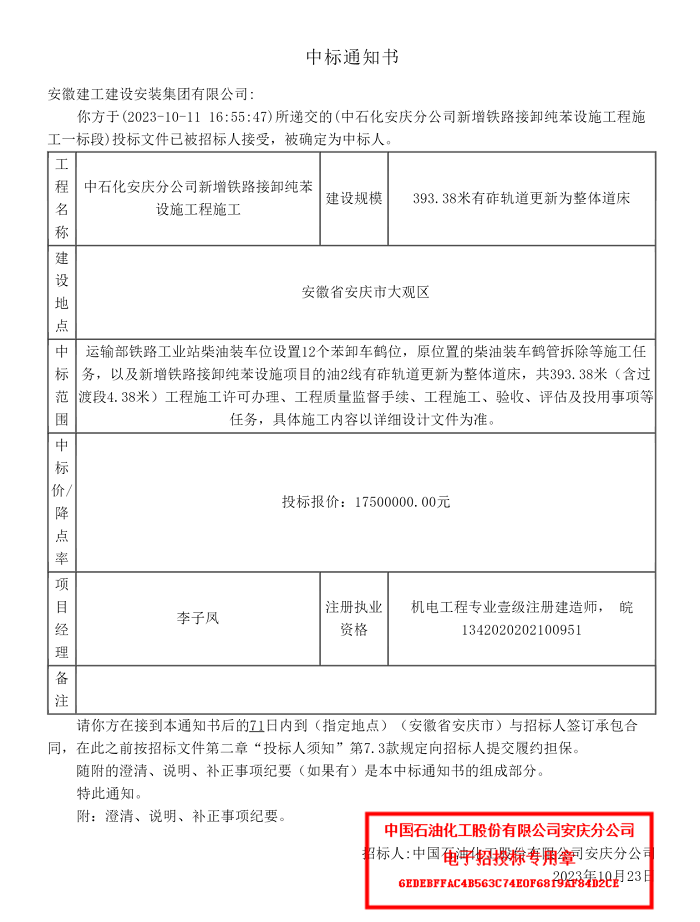 該項(xiang)目(mu)擬對中石(shi)化(hua)安慶分公司運輸部(bu)鐵(tie)路(lu)工業站柴油裝車位(wei)(wei)設置12個苯卸車鶴位(wei)(wei),以及新增(zeng)鐵(tie)路(lu)接卸純苯設施(shi)項(xiang)目(mu)的油2線(xian)有砟軌道(dao)更新為整體(ti)道(dao)床(chuang),共(gong) 393.38 米,計劃(hua)工期(qi)為71天。此次中標是(shi)2023年(nian)以來分公司繼化(hua)工園區儲運部(bu)六罐(guan)區重大安全(quan)風險消減(jian)治(zhi)理項(xiang)目(mu)以及2023年(nian)5月(yue)-2025年(nian)4月(yue)工程建設項(xiang)目(mu)施(shi)工總(zong)承包框架(jia)協(xie)議項(xiang)目(mu)兩個項(xiang)目(mu)中標后,連(lian)續在中石(shi)化(hua)安慶分公司中標的第(di)三個項(xiang)目(mu),也是(shi)分公司中標的首個鐵(tie)路(lu)整體(ti)道(dao)床(chuang)施(shi)工項(xiang)目(mu)。