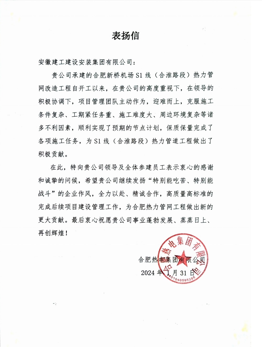 1月31日,合肥熱電集(ji)團(tuan)(tuan)有限公(gong)司(si)發來表揚信,就建工(gong)安裝集(ji)團(tuan)(tuan)對合肥新橋機(ji)場S1線(xian)(合淮路段)熱力管網改(gai)造工(gong)程做(zuo)出的(de)積(ji)極貢(gong)獻予以充分(fen)肯定和真(zhen)摯謝意。