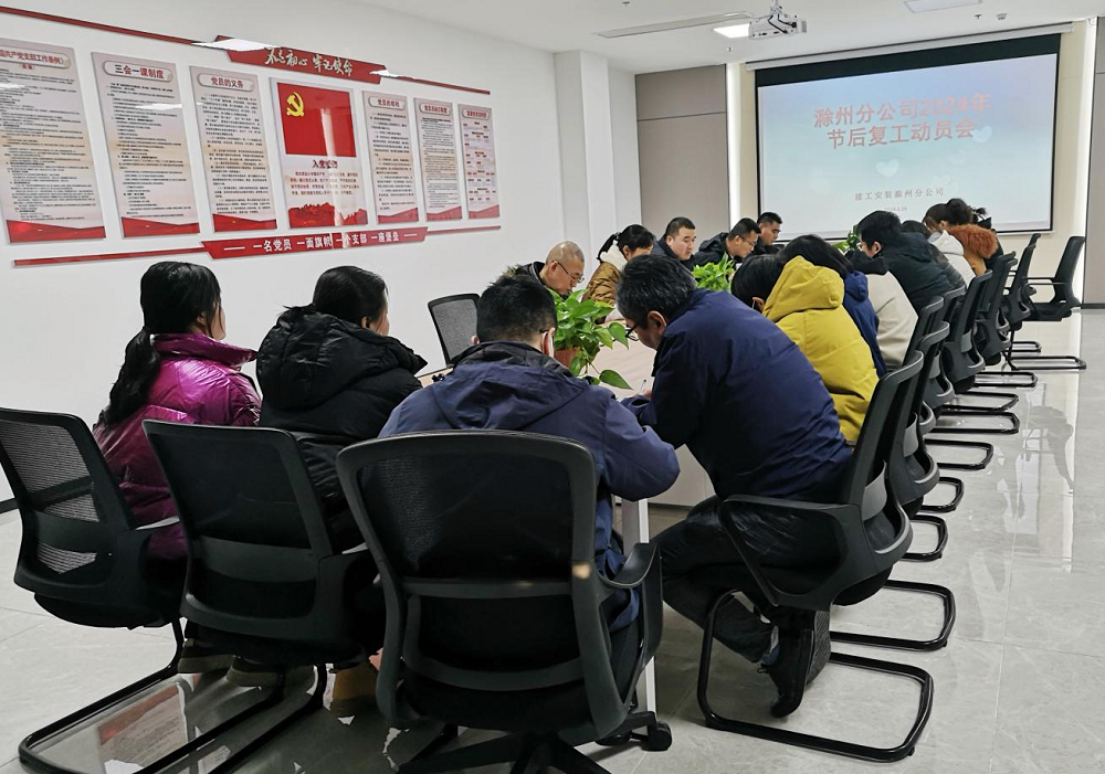 為認真貫徹落實集(ji)團、公(gong)司(si)《關于加(jia)強節(jie)(jie)后(hou)復工(gong)(gong)(gong)復產(chan)安全生產(chan)工(gong)(gong)(gong)作的通知》相關要求,平穩推進節(jie)(jie)后(hou)復工(gong)(gong)(gong)復產(chan)各項工(gong)(gong)(gong)作。2月26日(ri)下午,建工(gong)(gong)(gong)安裝滁(chu)州分公(gong)司(si)召開2024年節(jie)(jie)后(hou)復工(gong)(gong)(gong)復產(chan)動員(yuan)會,會議由(you)分公(gong)司(si)經理、黨支部副書記黃彥濤主持(chi),分公(gong)司(si)領導班子成員(yuan)、機關全體員(yuan)工(gong)(gong)(gong)參加(jia)會議。