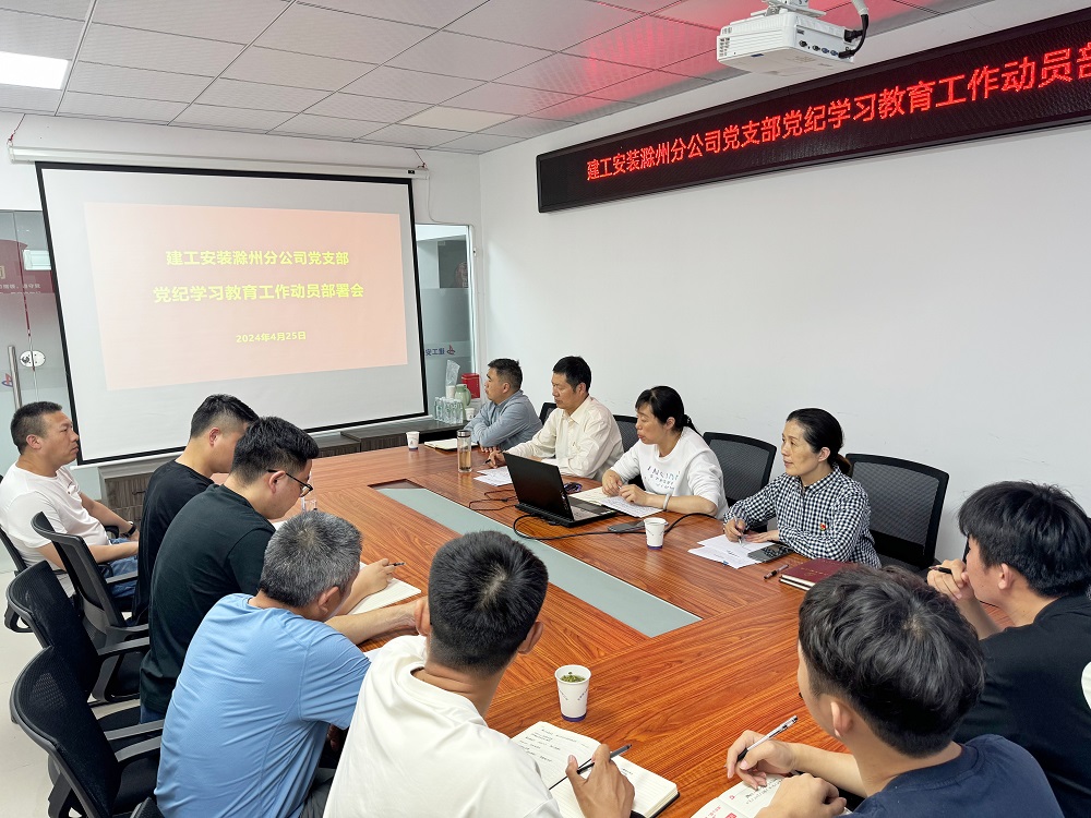 4月25日(ri)下午(wu),建(jian)工安裝滁州(zhou)分公司(si)(si)黨(dang)(dang)(dang)支部(bu)召開(kai)黨(dang)(dang)(dang)紀學(xue)(xue)(xue)習(xi)教育(yu)(yu)動員部(bu)署會(hui)。學(xue)(xue)(xue)習(xi)貫(guan)徹習(xi)近平總(zong)書記關(guan)(guan)于全面加強黨(dang)(dang)(dang)的(de)紀律建(jian)設的(de)重要論述,傳達學(xue)(xue)(xue)習(xi)黨(dang)(dang)(dang)中央關(guan)(guan)于黨(dang)(dang)(dang)紀學(xue)(xue)(xue)習(xi)教育(yu)(yu)的(de)決策部(bu)署和集團公司(si)(si)及(ji)公司(si)(si)黨(dang)(dang)(dang)委相關(guan)(guan)工作要求。分公司(si)(si)領導班子成員、全體黨(dang)(dang)(dang)員、部(bu)分機關(guan)(guan)部(bu)門(men)負責人等參加會(hui)議。