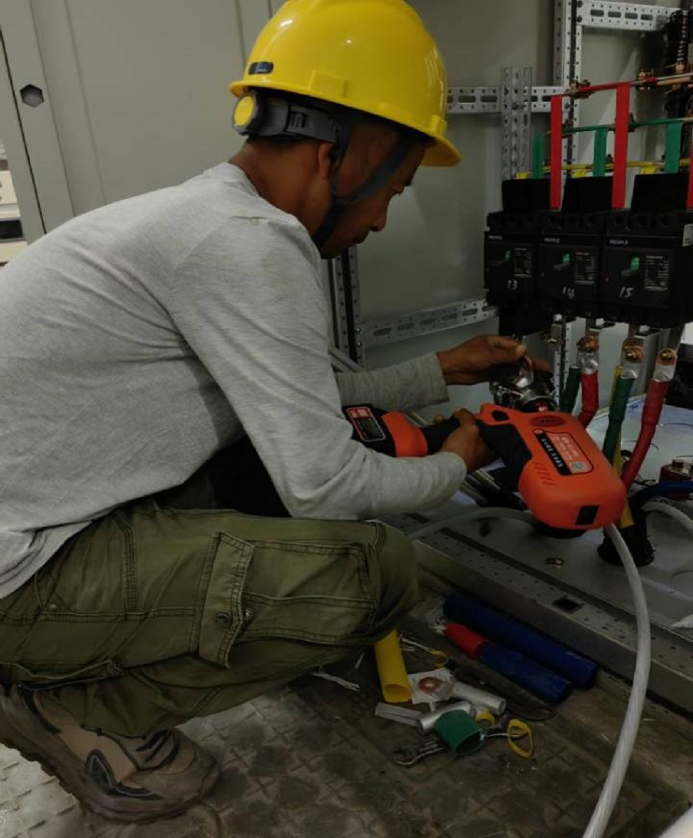 圖為工人使用(yong)壓線鉗制作(zuo)電纜(lan)頭