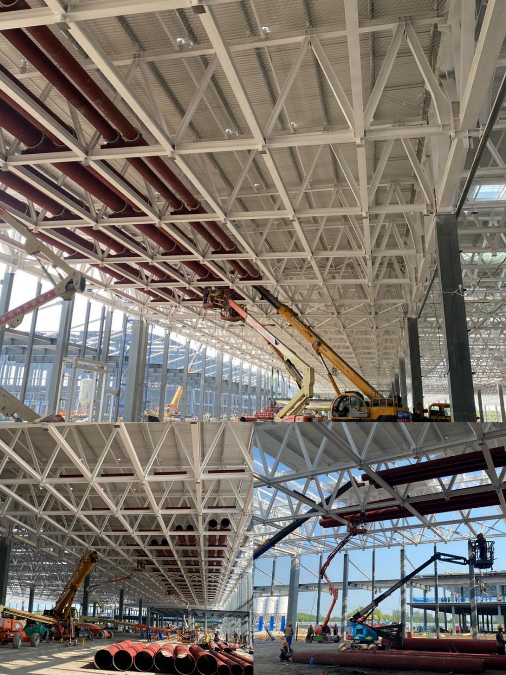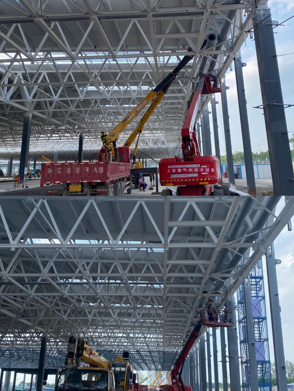 該項(xiang)目(mu)工(gong)期緊、任務重,項(xiang)目(mu)部(bu)開(kai)足馬力(li)搶抓節點(dian)(dian),充分合理調配人(ren)、材、機及(ji)(ji)資金等(deng)資源(yuan)。為搶抓晴好(hao)天氣,錯峰高(gao)溫時段,管(guan)理人(ren)員靠(kao)前指揮,作業人(ren)員并聯(lian)推進、多點(dian)(dian)開(kai)花,加班(ban)加點(dian)(dian)、挑燈夜戰。在確保安全(quan)質量的(de)前提(ti)下,優化(hua)施(shi)工(gong)方(fang)案,緊跟(gen)鋼結(jie)構(gou)及(ji)(ji)土建單位的(de)施(shi)工(gong)進度(du)“見縫插針”,全(quan)力(li)推進本項(xiang)目(mu)的(de)建設進度(du)。