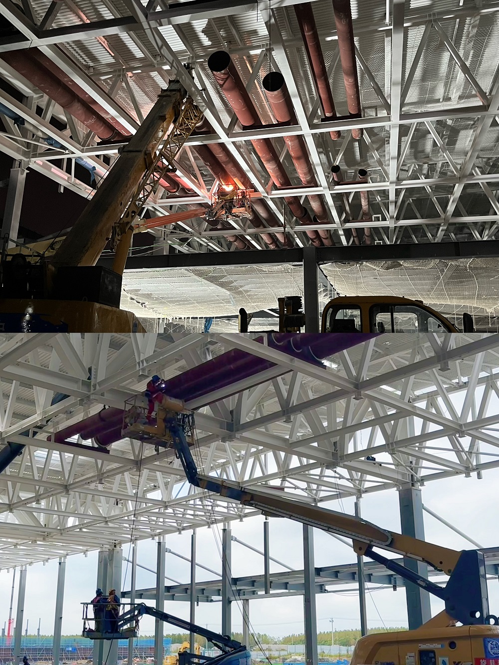 該項(xiang)目(mu)(mu)本階段正在進行各車間直徑DN700、DN800的(de)空(kong)調(diao)冷凍水(shui)管道(dao)吊裝(zhuang)(zhuang)(zhuang)搶工(gong)(gong)。為了能早日(ri)完成空(kong)調(diao)冷凍水(shui)管道(dao)吊裝(zhuang)(zhuang)(zhuang)的(de)工(gong)(gong)程節點目(mu)(mu)標,項(xiang)目(mu)(mu)管理(li)人員以工(gong)(gong)期進度為主線,多次(ci)召(zhao)開技(ji)術(shu)商討會(hui),合理(li)優化吊裝(zhuang)(zhuang)(zhuang)施工(gong)(gong)方案(an),全(quan)體員工(gong)(gong)實行24小時輪班工(gong)(gong)作制,夜晚輪流值班,晝夜奮戰、奮勇爭(zheng)先,發(fa)起項(xiang)目(mu)(mu)加速(su)建設的(de)“最強(qiang)攻勢(shi)”。