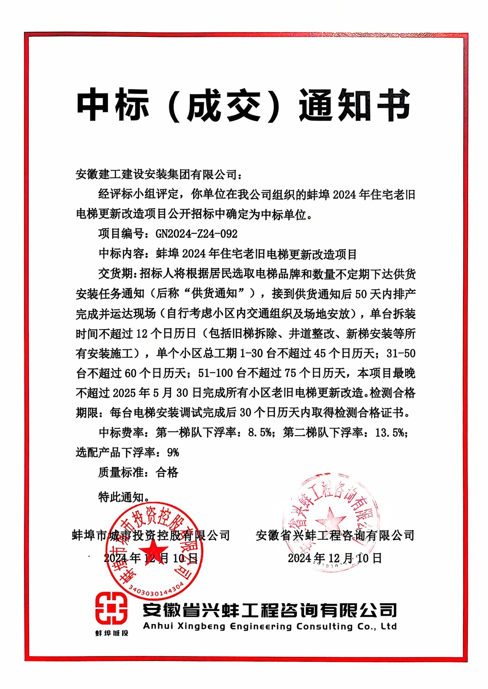 12月(yue)10日(ri),建工安裝(zhuang)電梯分(fen)公司成功收到蚌埠2024年住宅老舊電梯更(geng)新改造項目中標通知書!