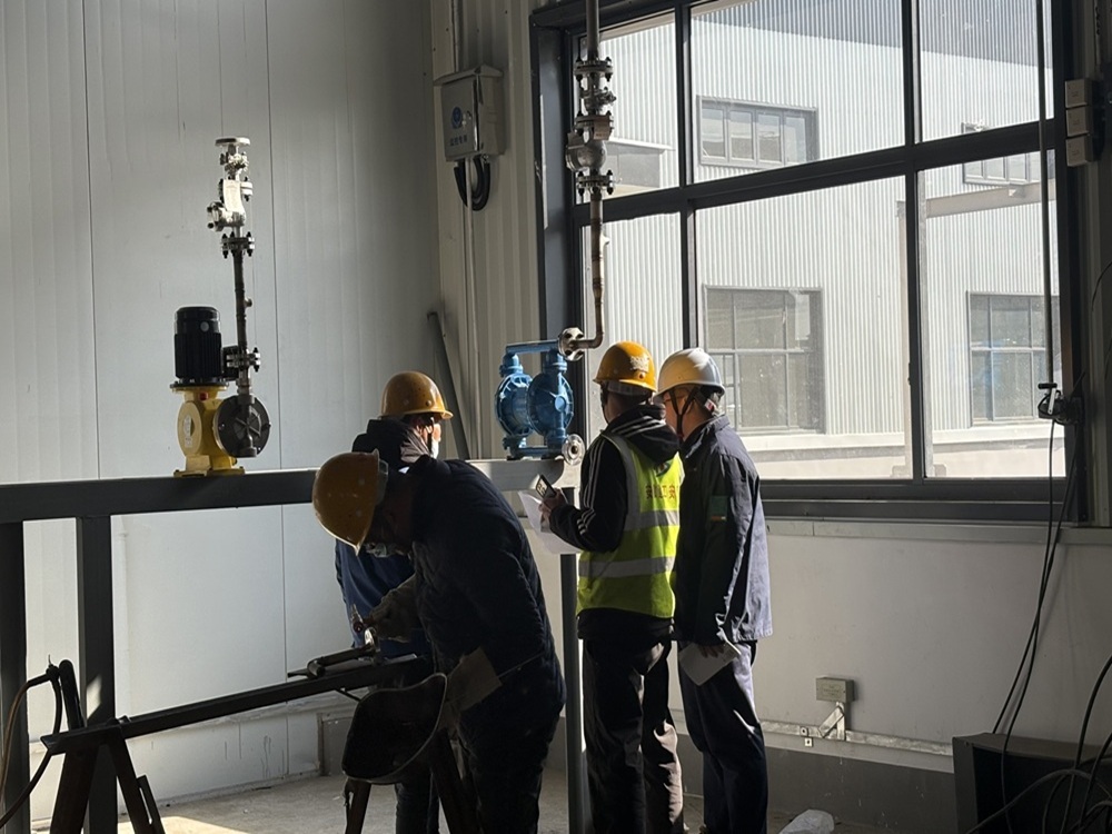 施工(gong)人員正在進行圖紙核對及管道焊接